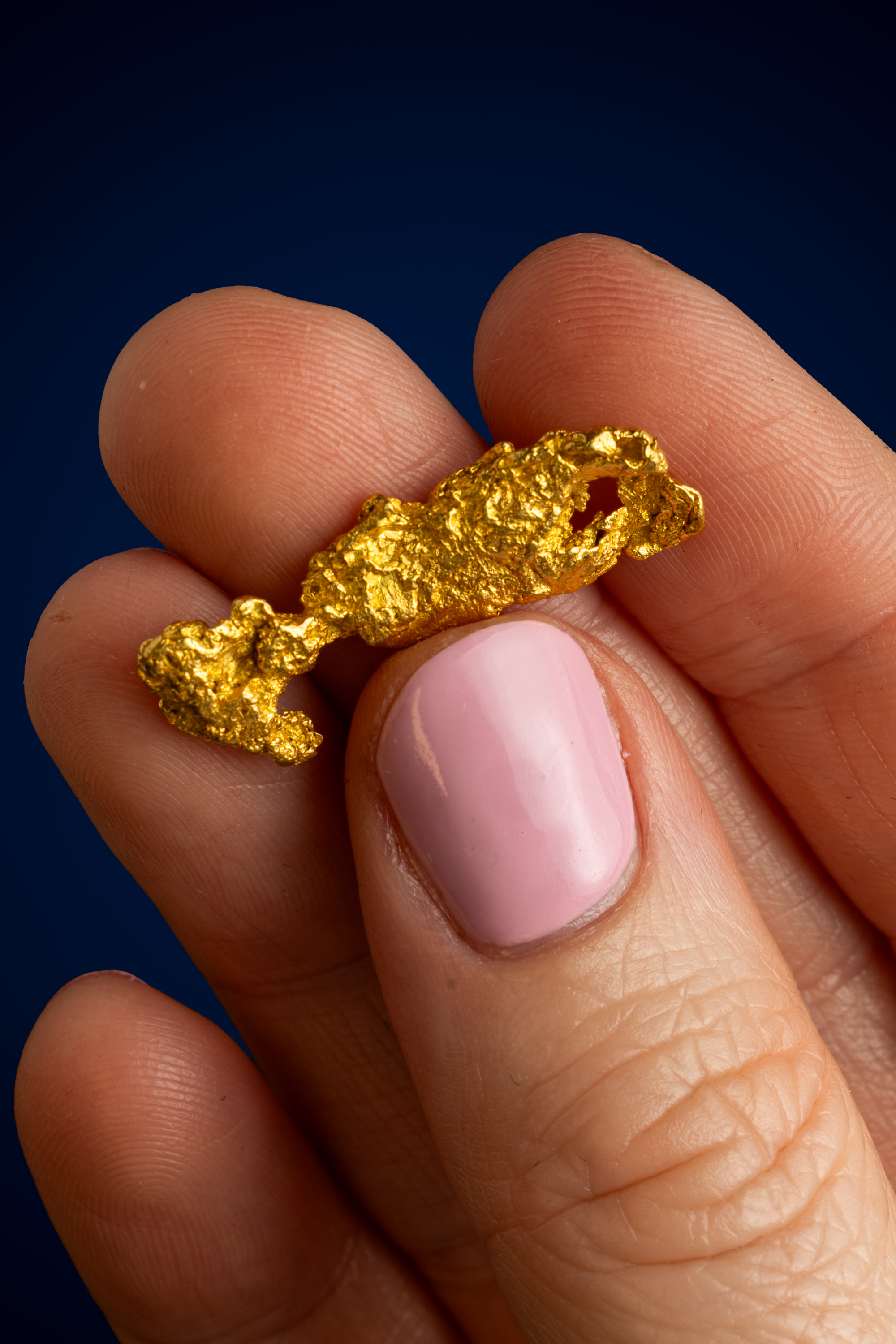 The surface reveals a blend of gently polished areas and finer textural detail, reflecting its journey through California’s historic gold-bearing waterways. Bright and highly lustrous, this nugget carries the unmistakable warmth and character that California gold is known for. A unique and eye-catching collectible, it makes an excellent display piece and a tangible connection to the Golden State’s legendary gold rush heritage.