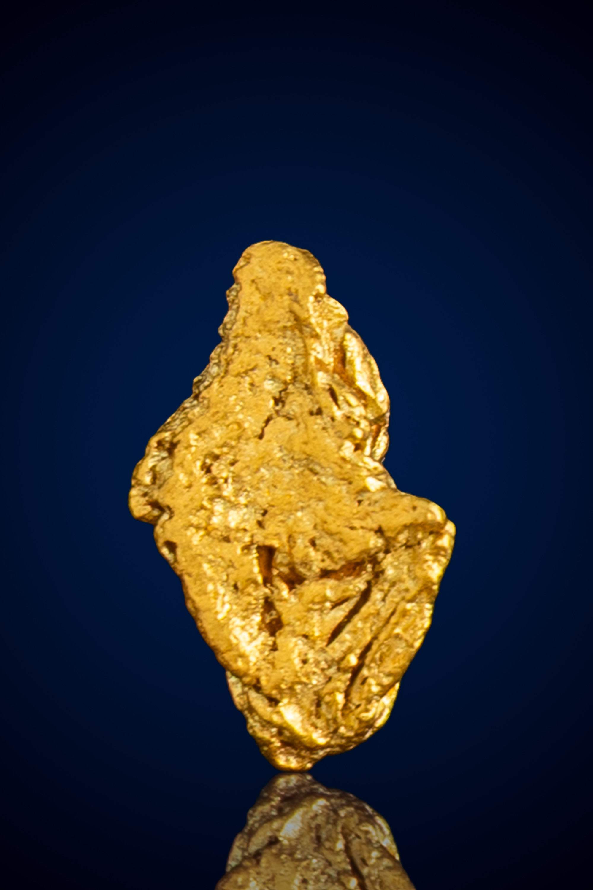 This beautiful crystallized gold specimen from Georgetown, Australia showcases the distinctive character and rich color that make gold from this region so highly sought after. The piece displays a natural, irregular form with a mix of smooth, water-worn areas and subtle crystalline texture, reflecting its origin from a lode source and subsequent natural shaping.