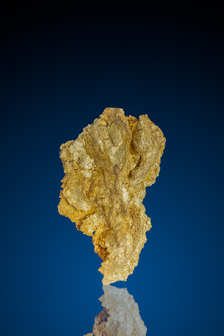 This impressive gold-in-quartz nugget from Round Mountain, Nevada is a standout example of richly mineralized lode gold, combining bold visual contrast with classic Nevada character. Bright native gold is distributed throughout a rugged, milky white quartz matrix, creating a striking interplay of color and texture. The surface is alive with intricate detail — fine granular gold and irregular veinlets weave through the quartz, giving the piece a naturally sculptural, almost frosted appearance.