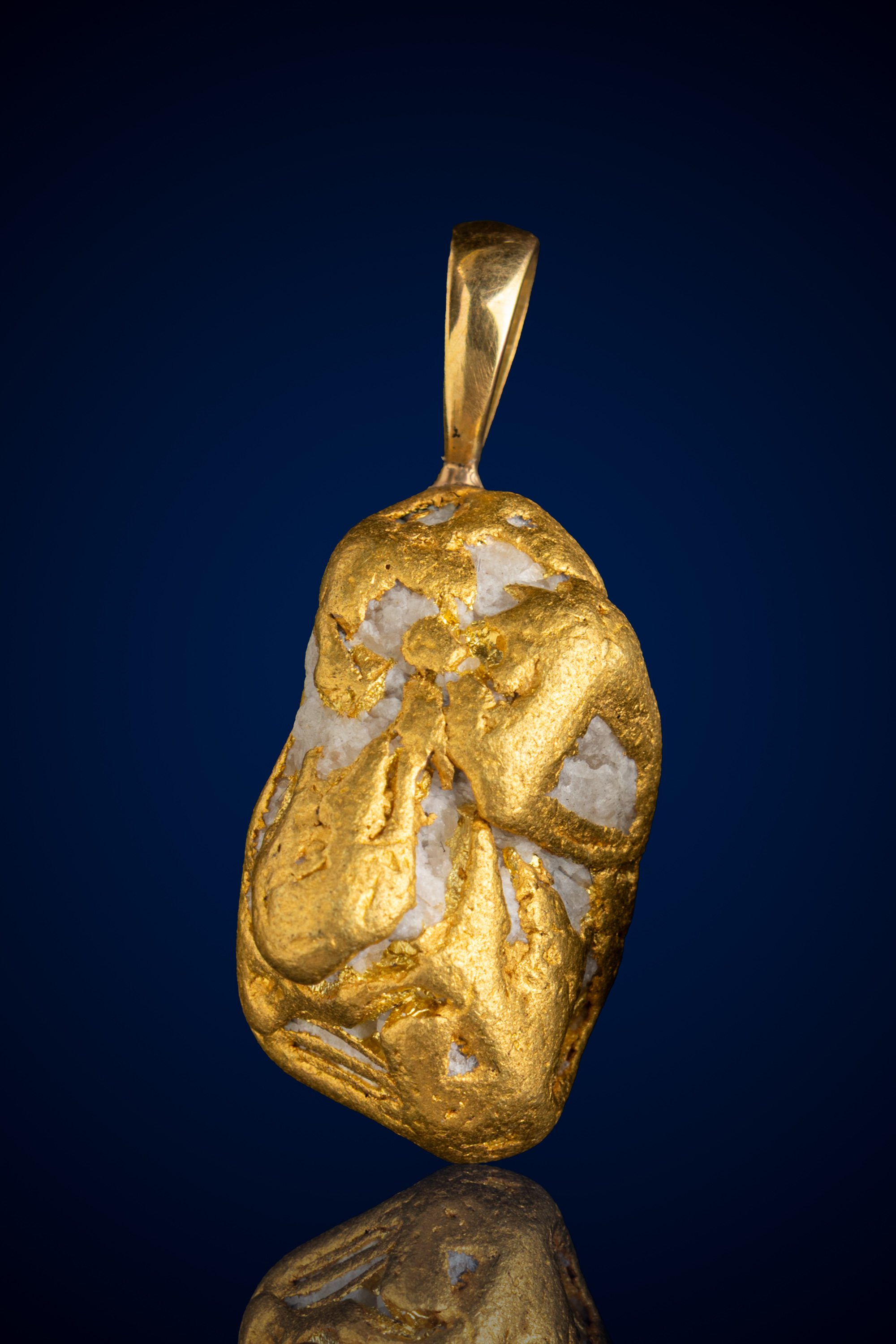 This striking pendant features a genuine natural gold nugget beautifully intergrown with quartz, creating a bold contrast between bright, buttery gold and the soft, crystalline white matrix beneath. The gold forms smooth, flowing bands and sculptural overlays across the surface, partially encasing the quartz and creating natural windows and openings that add depth and visual intrigue. Its rich luster and dimensional structure catch the light from every angle, giving the piece a dynamic, almost architectural presence.