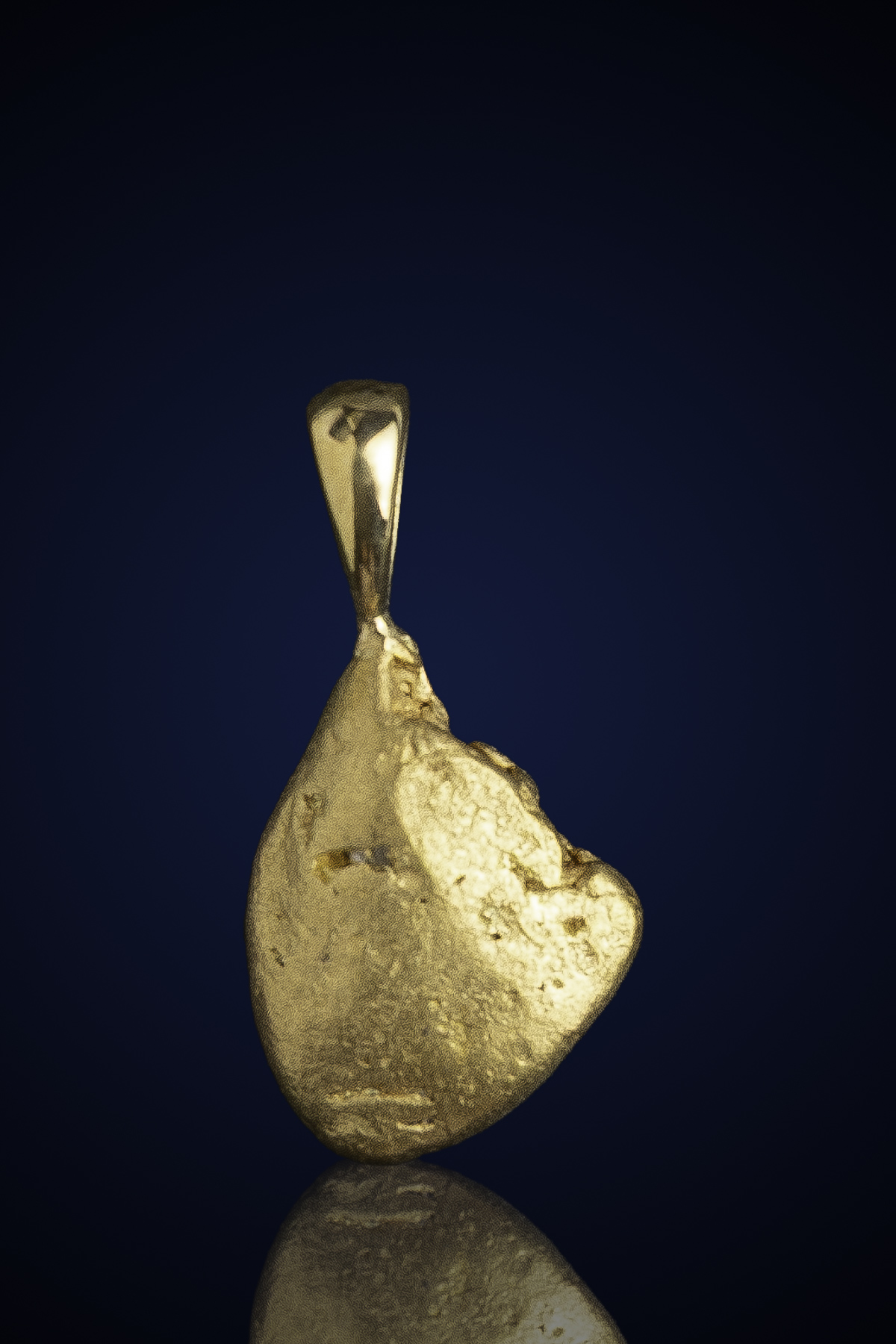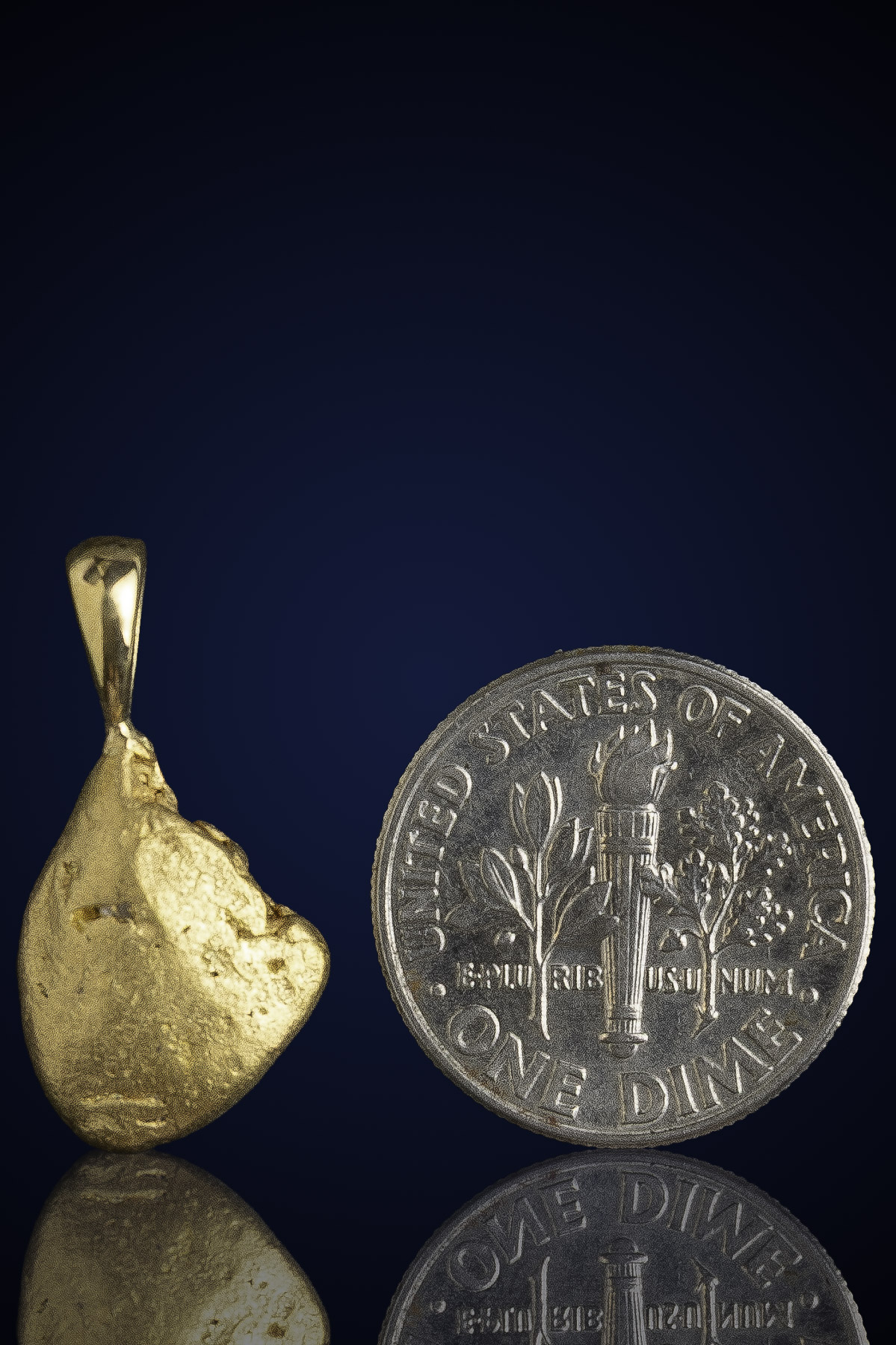 This stunning pendant features a genuine natural gold nugget from Alaska, one of the most prolific and storied gold-producing regions in the world. This nugget showcases a rich, buttery gold color and shining, exceptional luster, forged by millions of years of geological forces. It has been expertly set with a solid gold bail, sized to accommodate a wide range of chains while complementing — rather than overpowering — the nugget’s organic sculptural form.