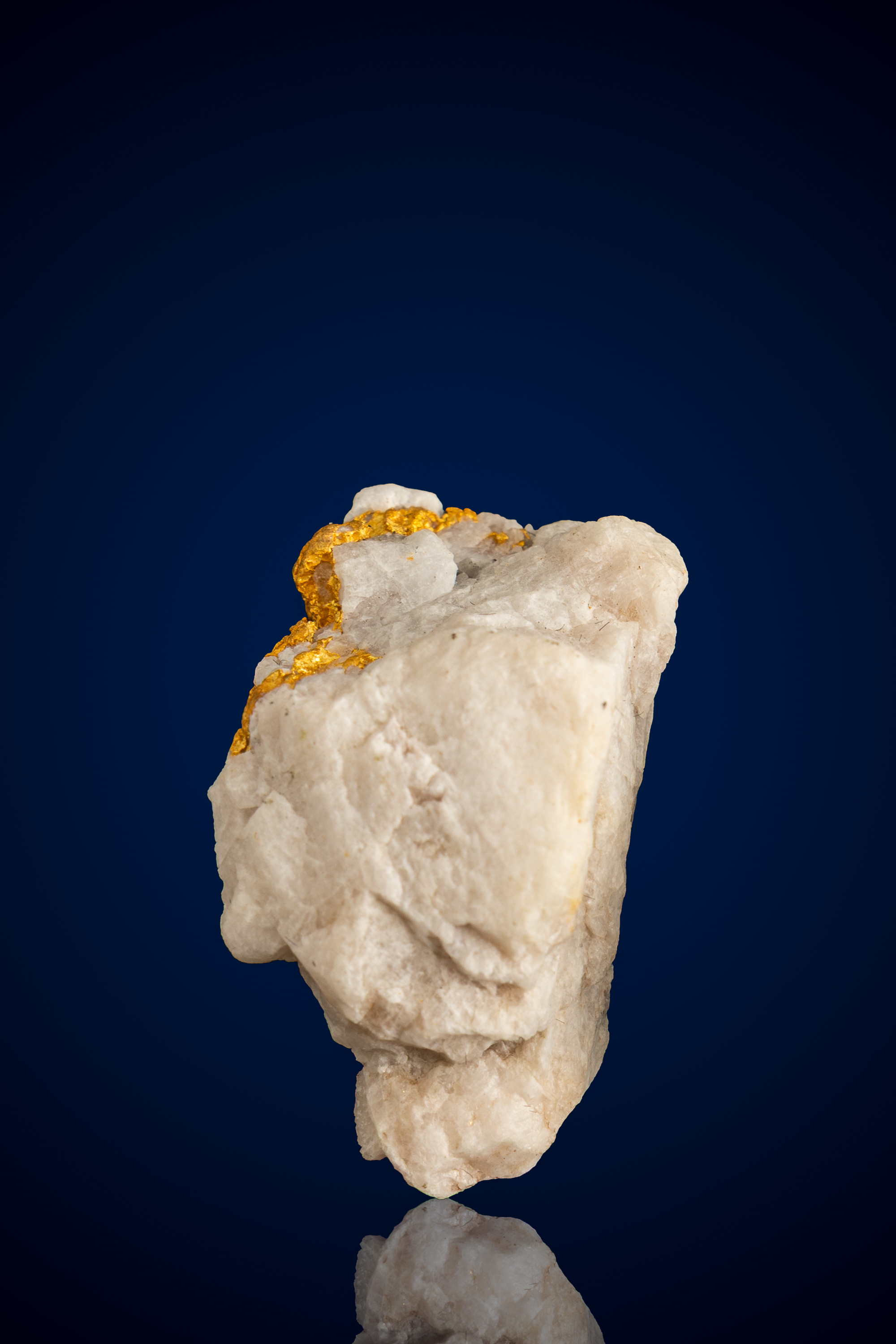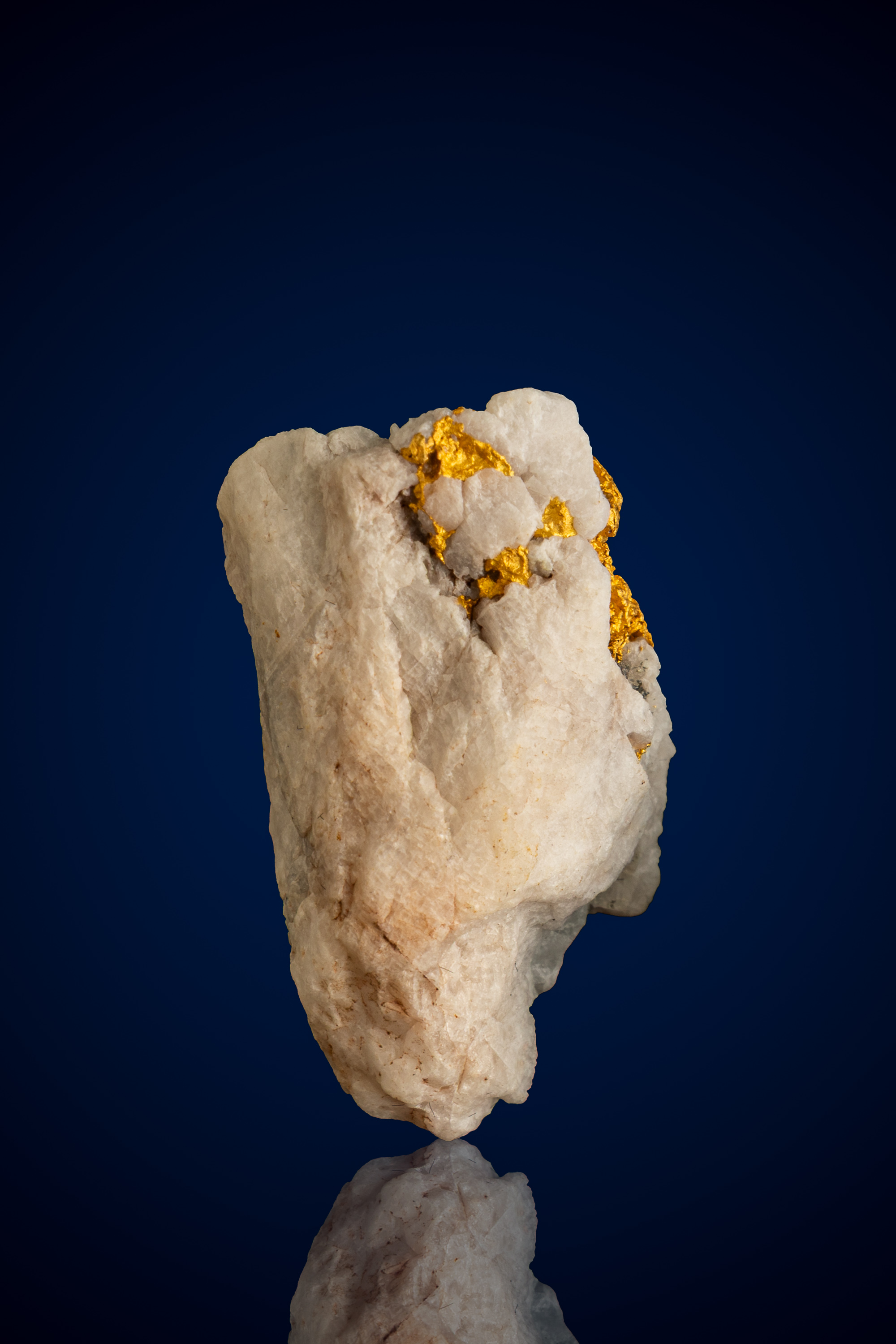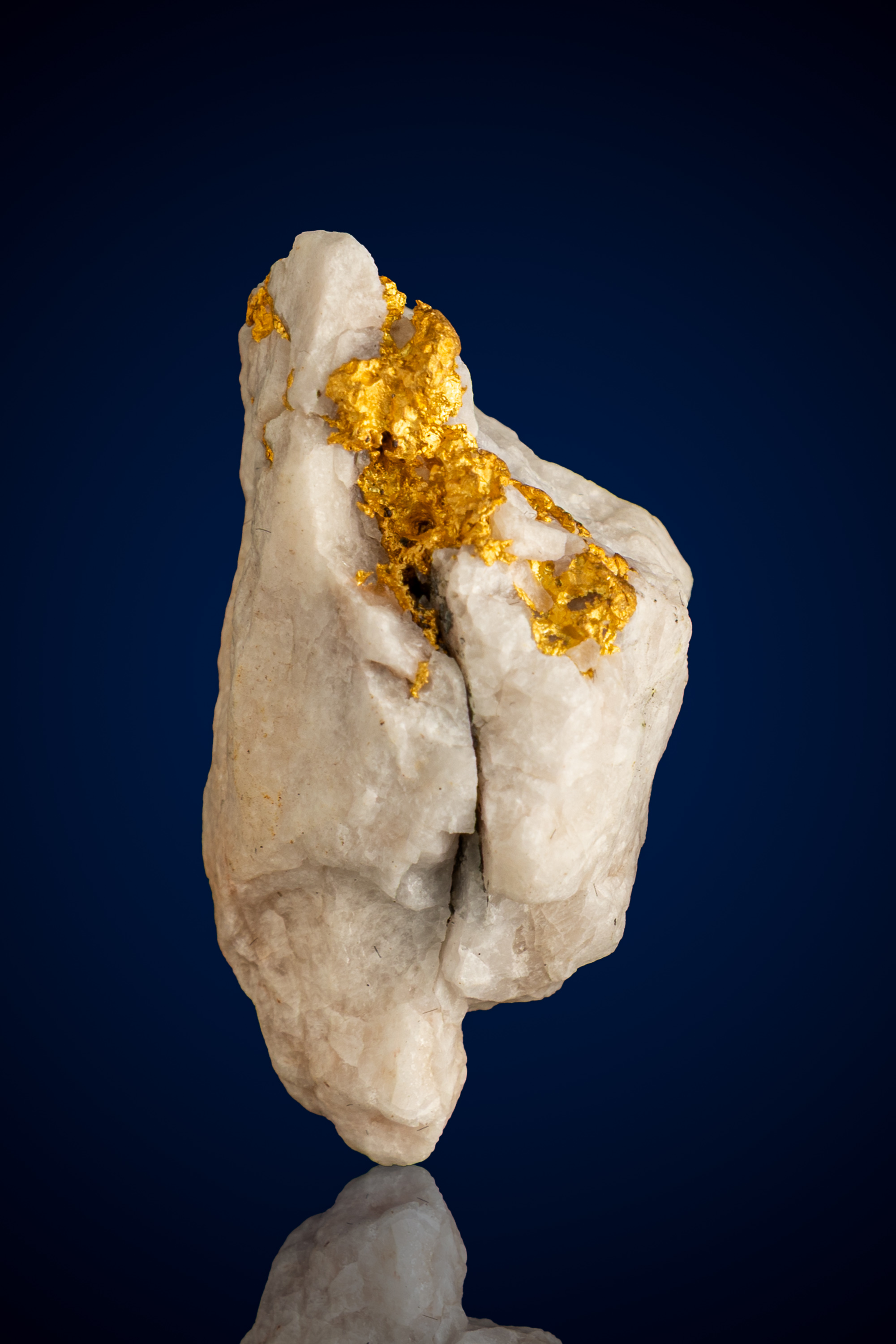 This striking native gold on quartz specimen from the Alleghany Mining District, CA is a beautiful example of delicate, lode-grown gold crystallization preserved on a contrasting quartz matrix. Bright, richly colored gold forms elegant branching and leafy crystalline growths that rise dramatically from the surface of the milky quartz host.