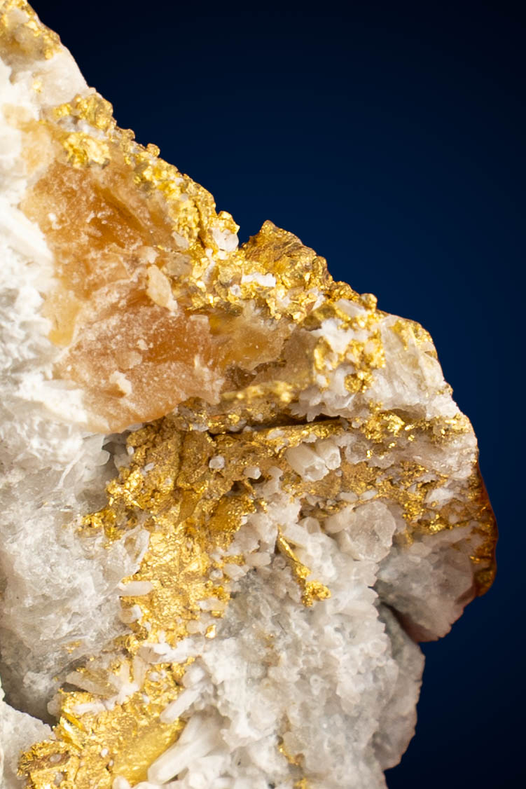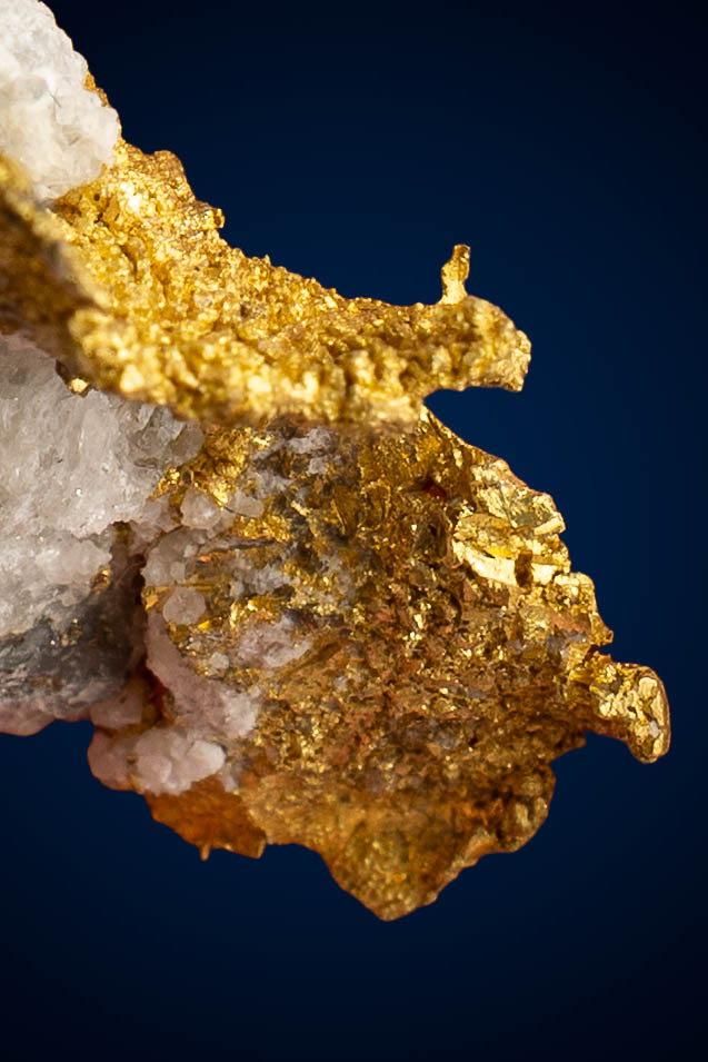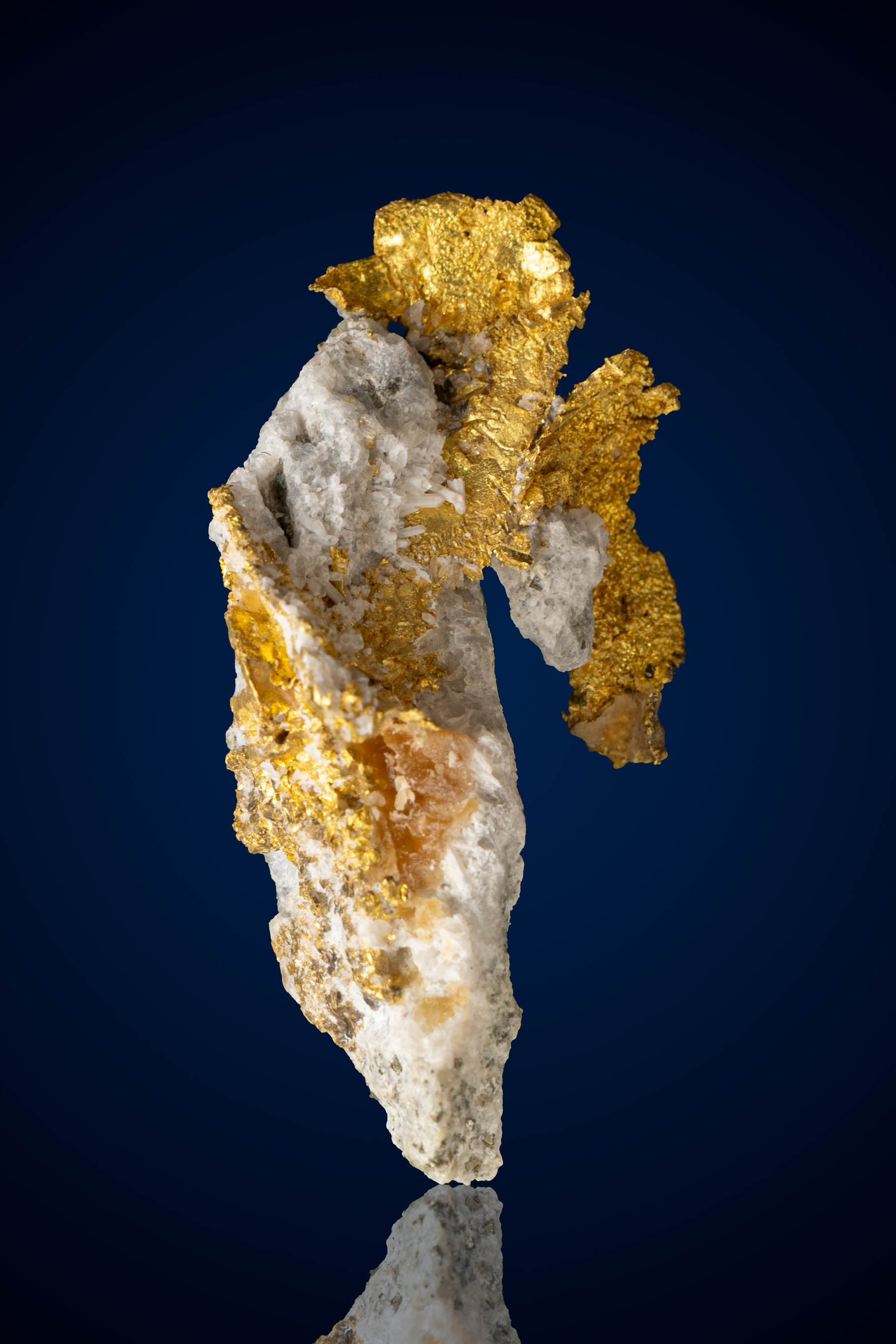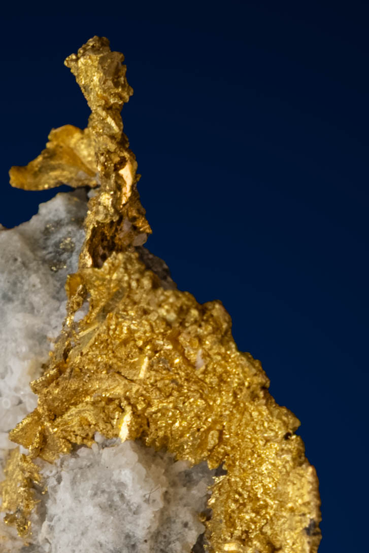This striking native gold on quartz specimen from the Oriental Mine is a beautiful example of delicate, lode-grown gold crystallization preserved on a contrasting quartz matrix. Bright, richly colored gold forms elegant branching and leafy crystalline growths that rise dramatically from the surface of the milky quartz host.