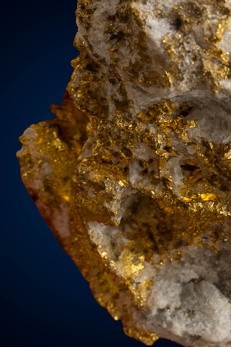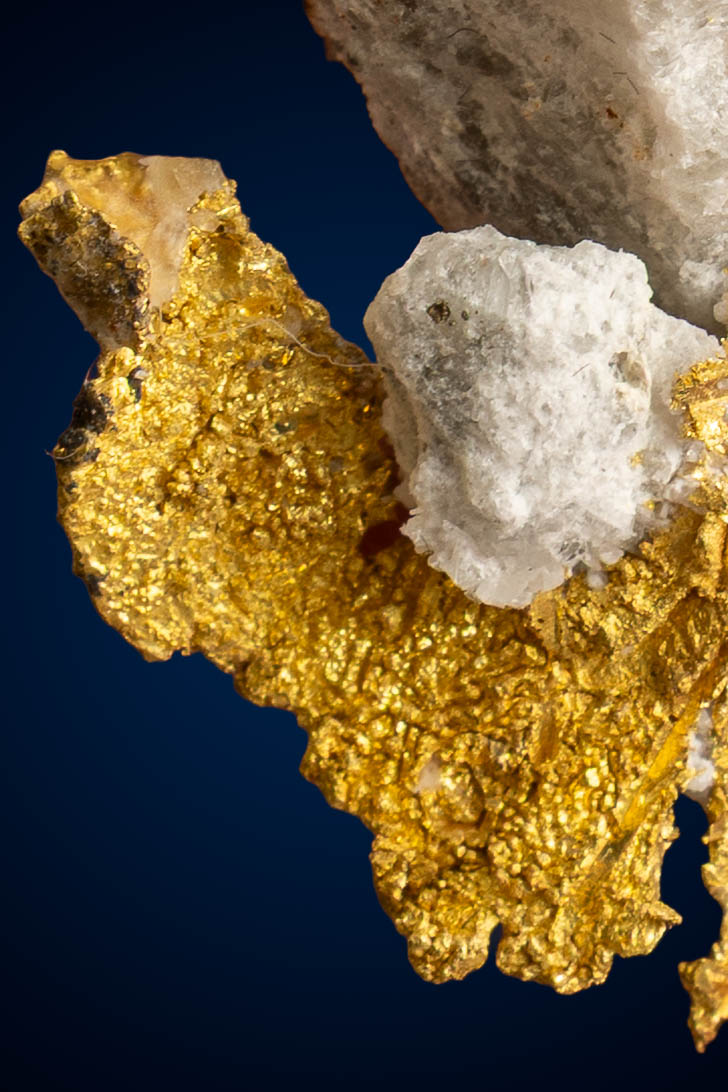 The gold exhibits a natural crystalline texture with intricate surfaces that catch and reflect light from every angle, highlighting the vivid contrast between the warm metallic luster of the gold and the cool, translucent tones of the quartz matrix. Specimens from the Oriental Mine are highly regarded for their aesthetic gold crystallization, and this piece displays that character beautifully.