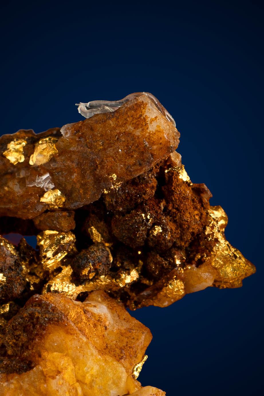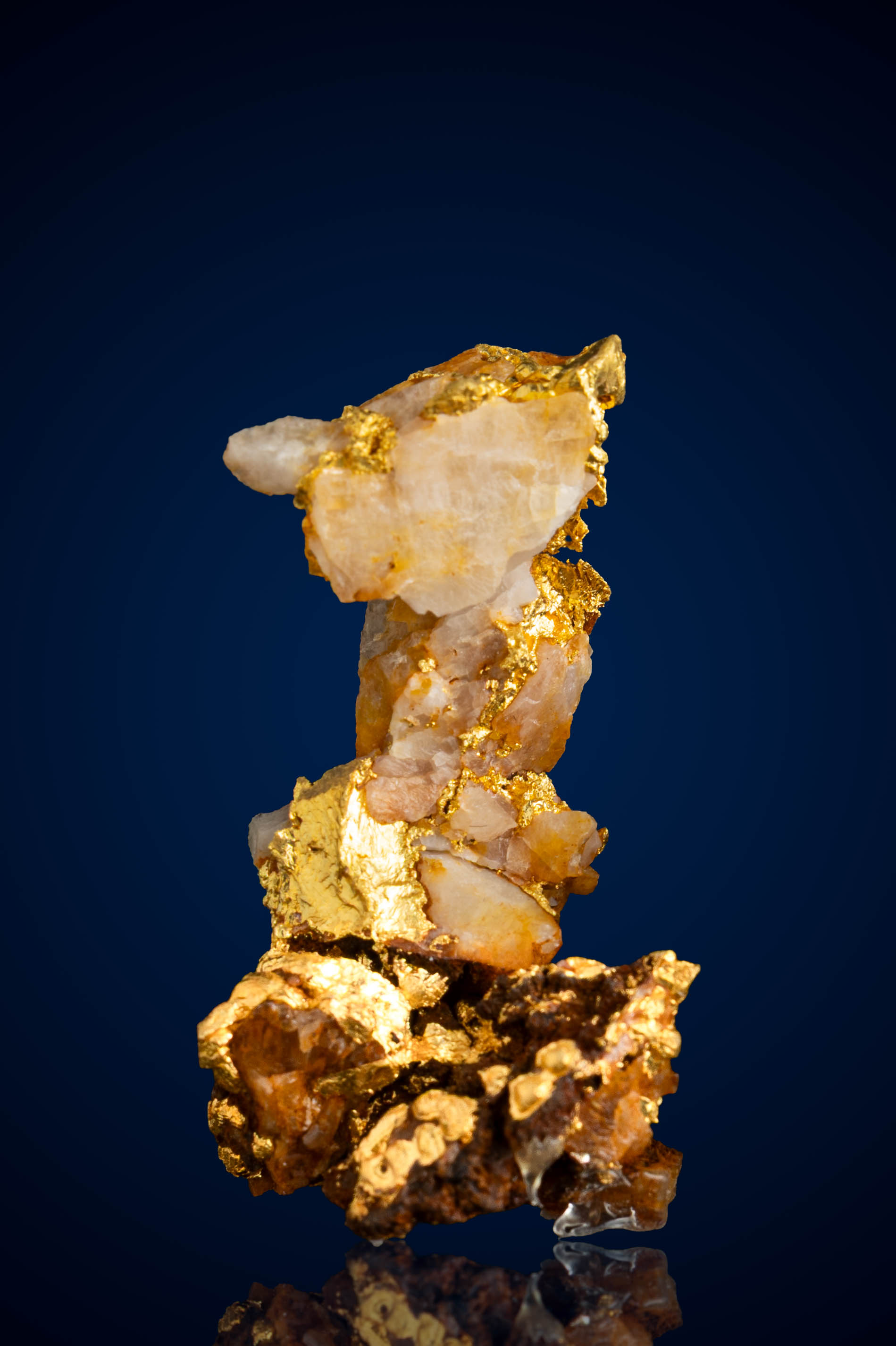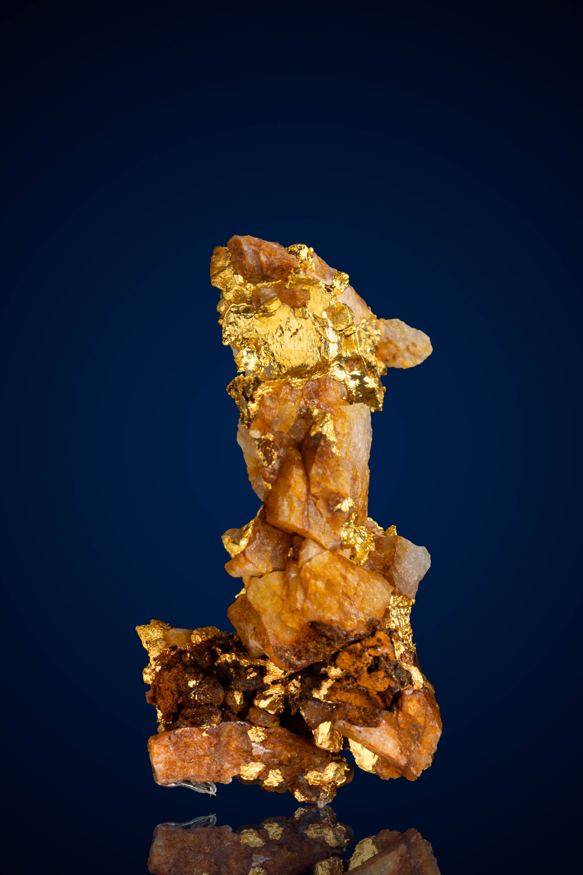 This piece features richly colored, iron-stained quartz crystals rising in a sculptural, vertical formation, dramatically accented by brilliant native gold. The gold presents as bright, lustrous plates and irregular crystalline masses perched along the quartz faces, creating striking contrast between the warm metallic sheen and the earthy amber tones of the host matrix.