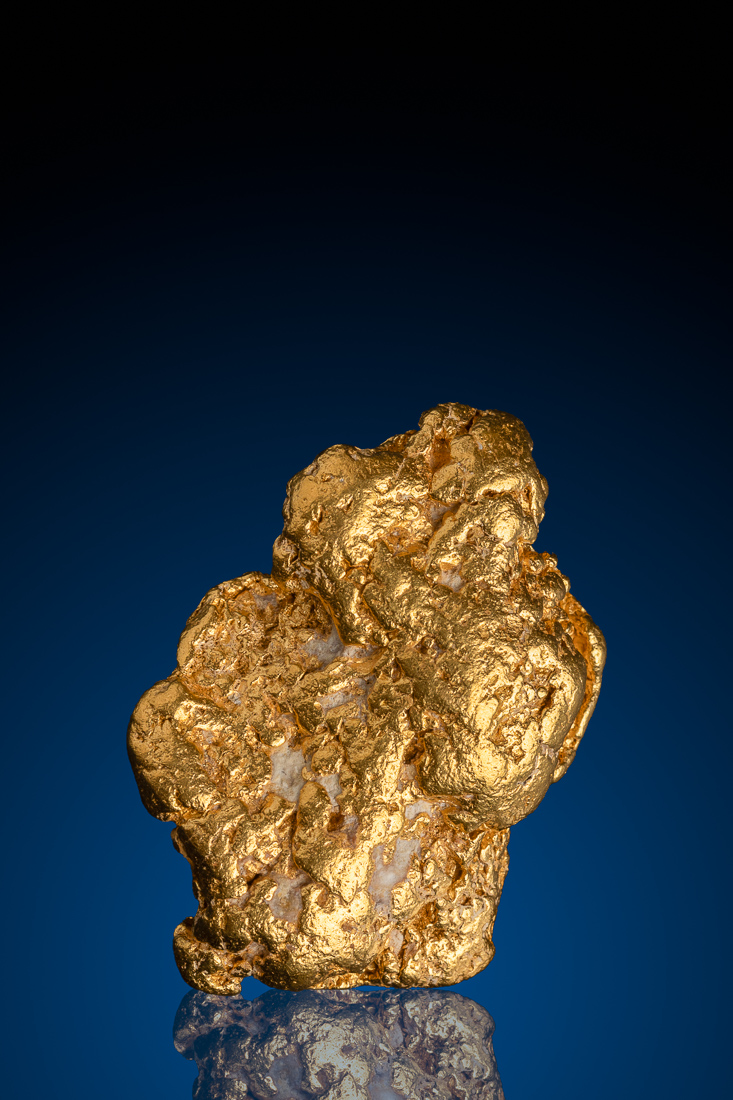 Subtle quartz remnants are nestled within the structure, providing a pleasing contrast against the warm, saturated gold tones and offering a glimpse into the nugget’s geological origin. The interplay between smoother surfaces and more rugged zones creates a dynamic, multi-dimensional appearance that responds beautifully to light.