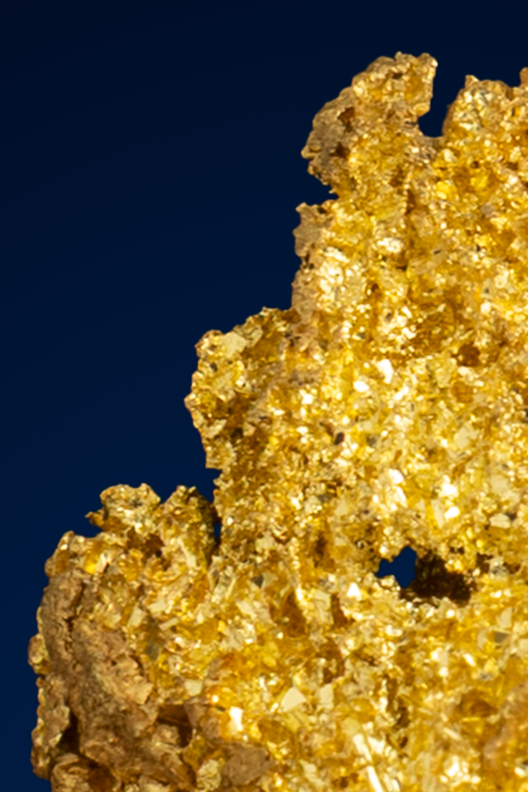 This beautiful crystalline gold specimen from the Oriental Mine in the Alleghany Mining District, Sierra County, California showcases the intricate natural textures that make gold from this historic region so highly prized by collectors. The piece displays a richly textured surface of tightly intergrown gold crystals, forming a sculptural mass with delicate ridges, cavities, and naturally contoured growth patterns.
