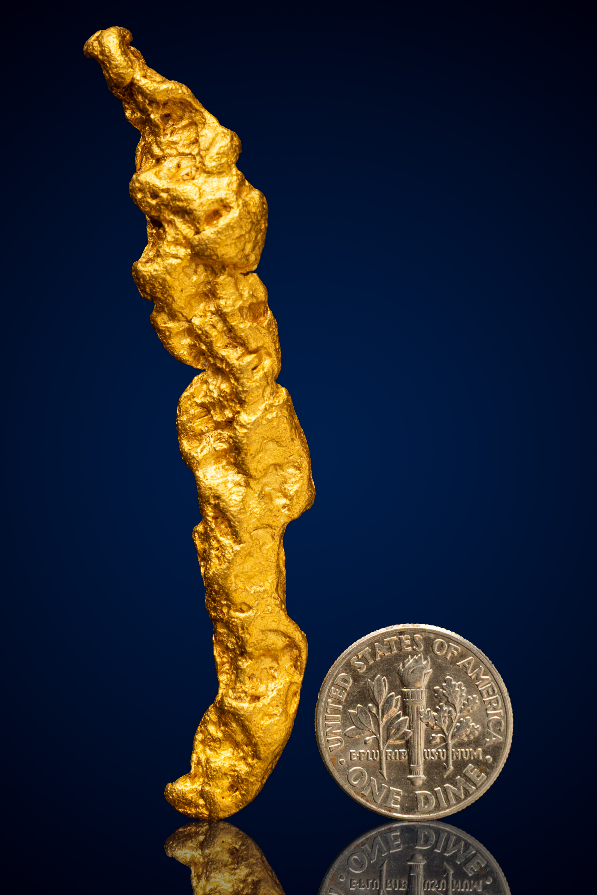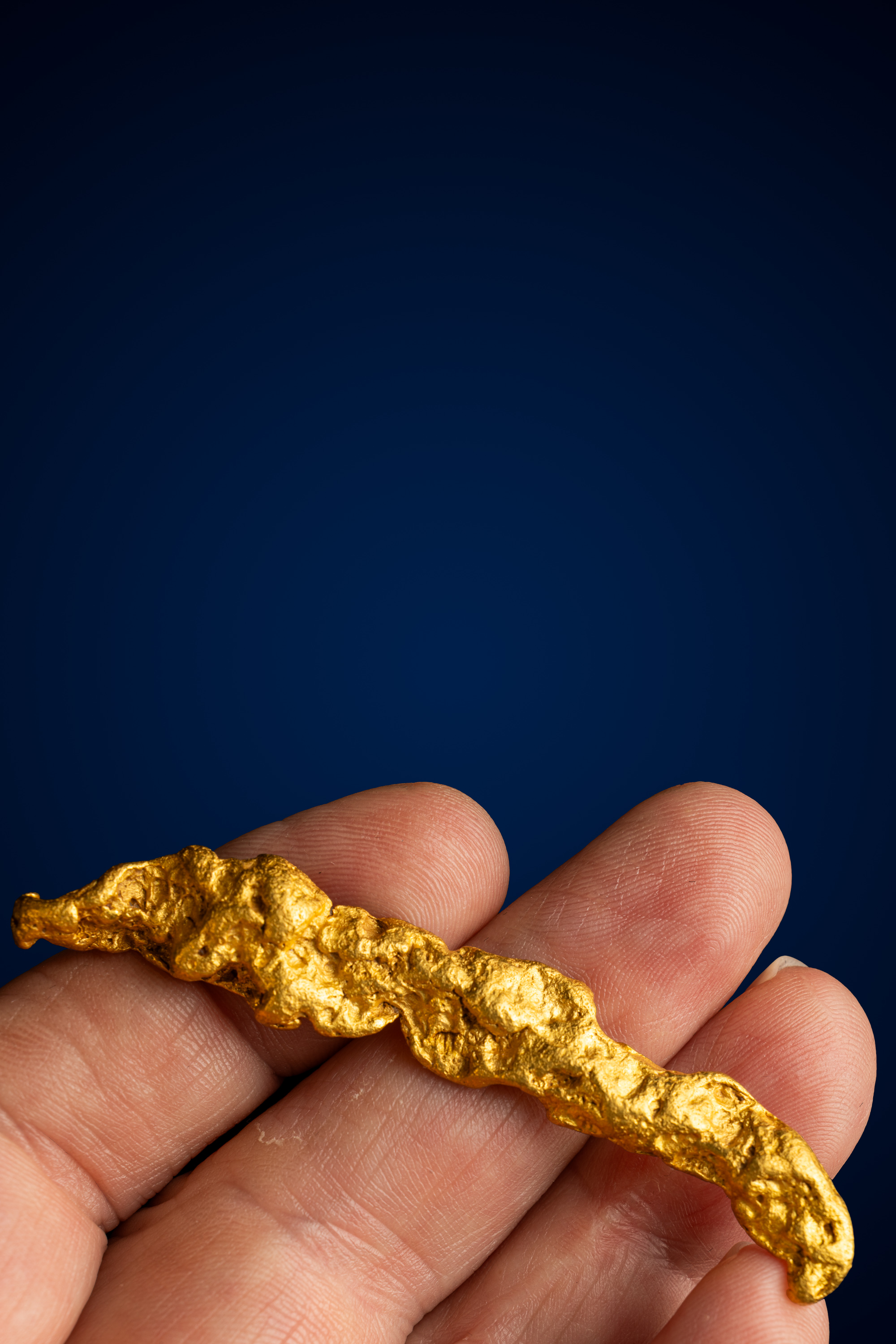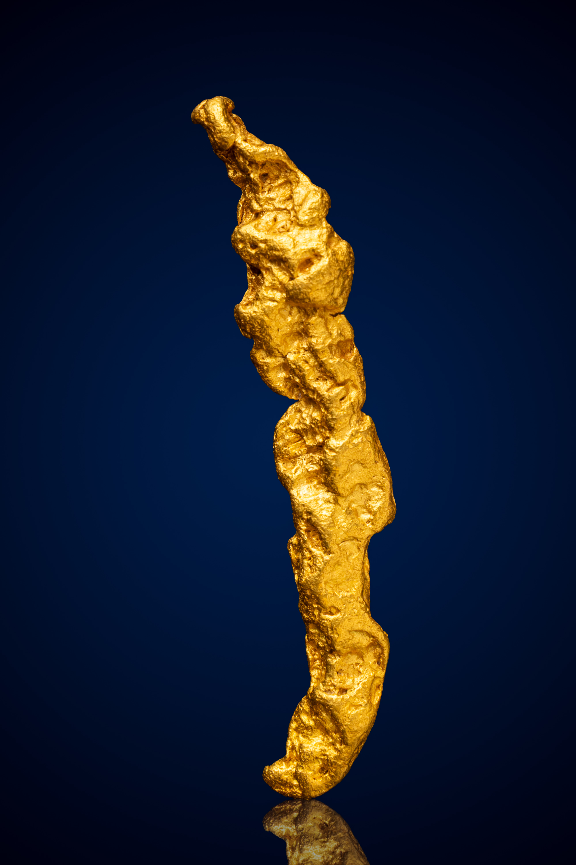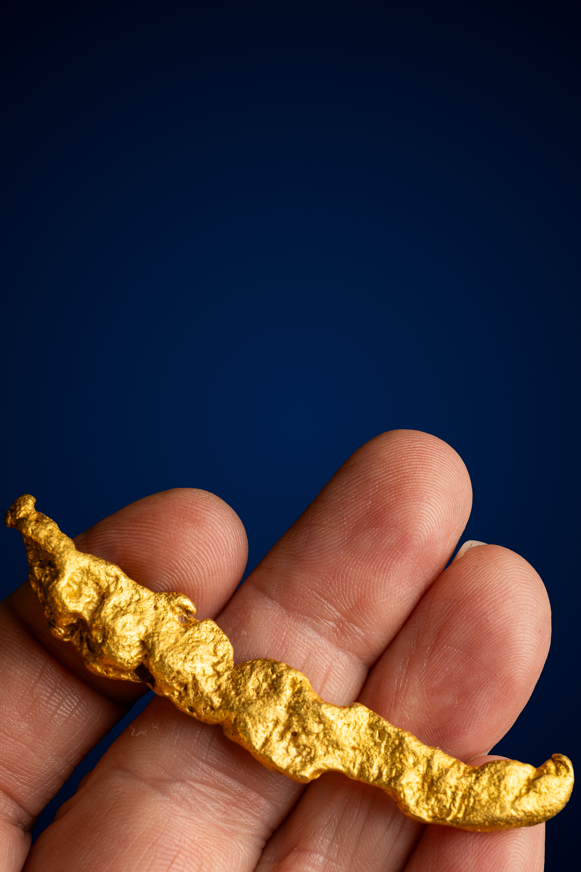 The nugget’s slender, sculptural profile gives it a sense of movement and refinement rarely seen in placer gold, making it especially appealing as a display piece. Variations in texture — from smoother, gently worn areas to more granular sections — add depth and character, enhancing its natural beauty.