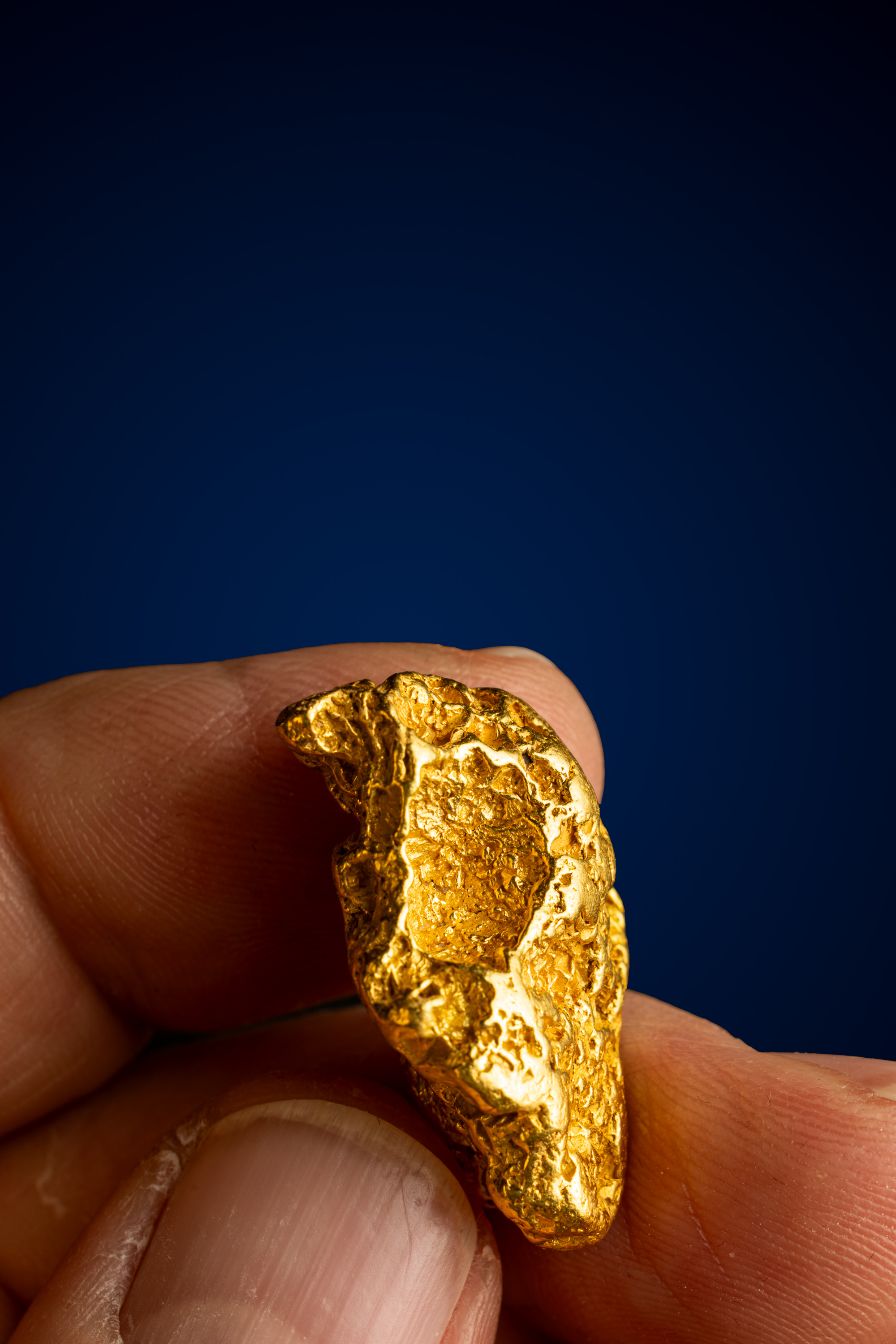 The surface carries a warm, buttery luster, with subtle ridges, shallow pockets, and intricate detail that catch the light from every angle. These natural features reflect the nugget’s journey through active placer ground, where centuries of movement have shaped its organic form while preserving its strong, dimensional presence.