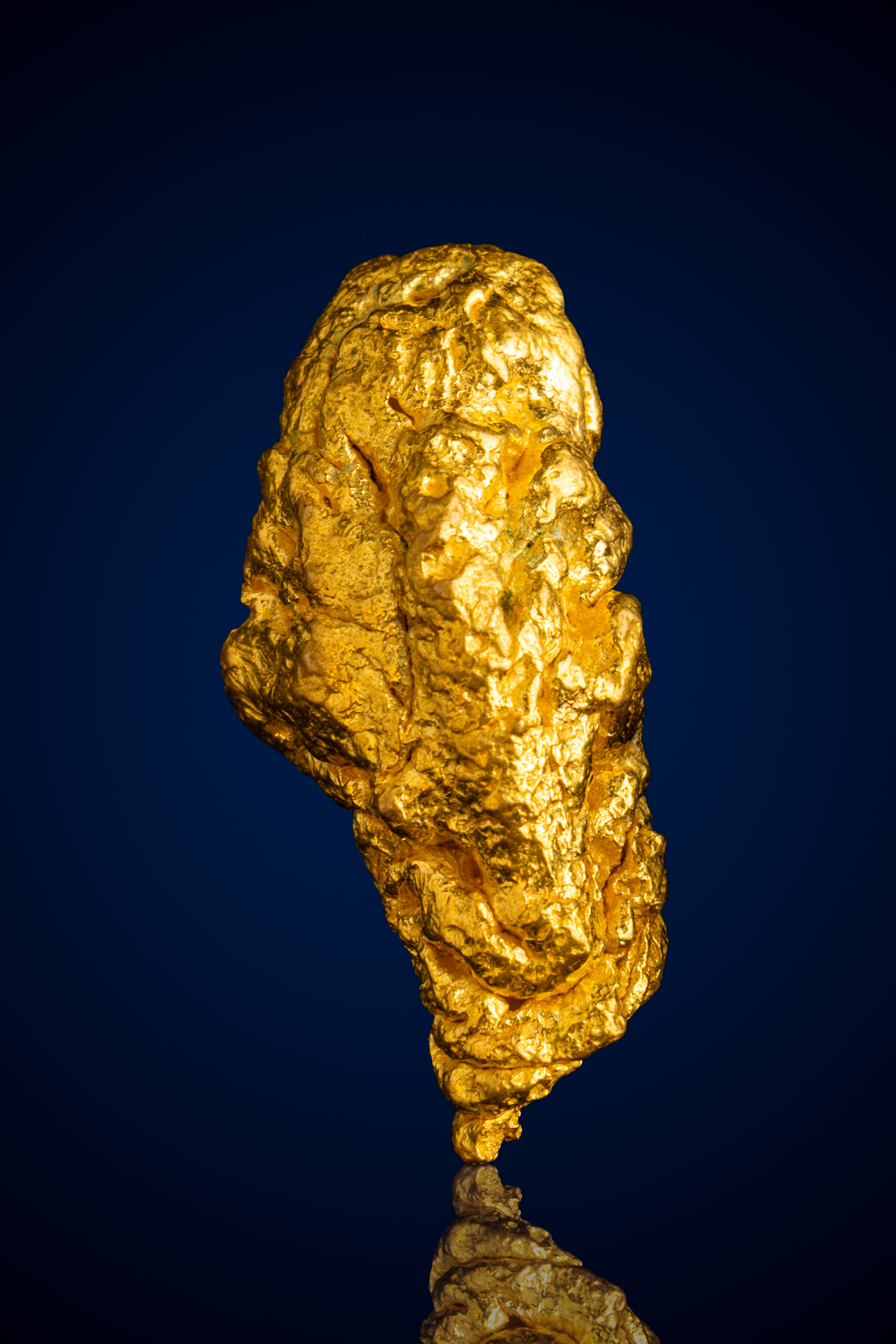 This beautiful natural gold nugget is a classic example of Australian placer gold, featuring a bold, elongated form with a richly sculpted, high-relief surface. Its warm, buttery luster is immediately striking, enhanced by a complex network of flowing ridges, recessed channels, and organically layered textures that give the piece exceptional depth and visual interest.