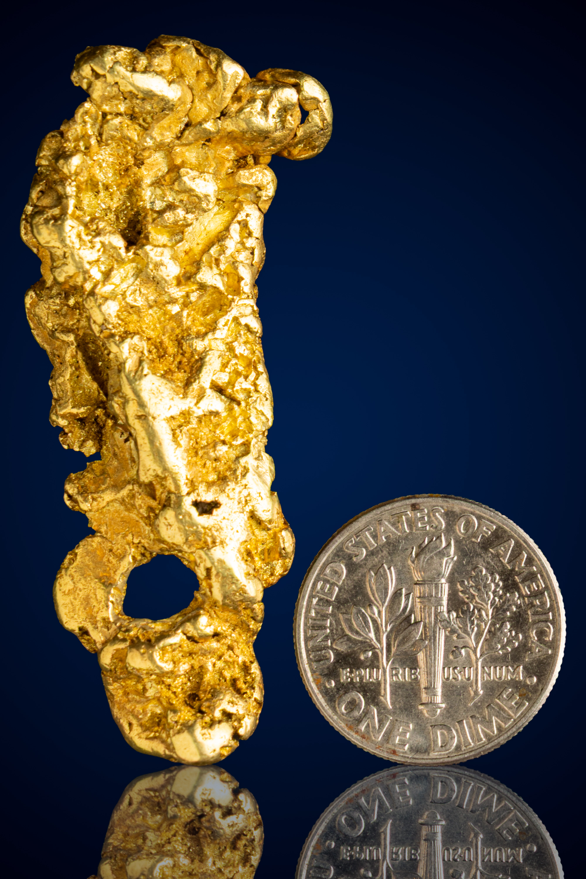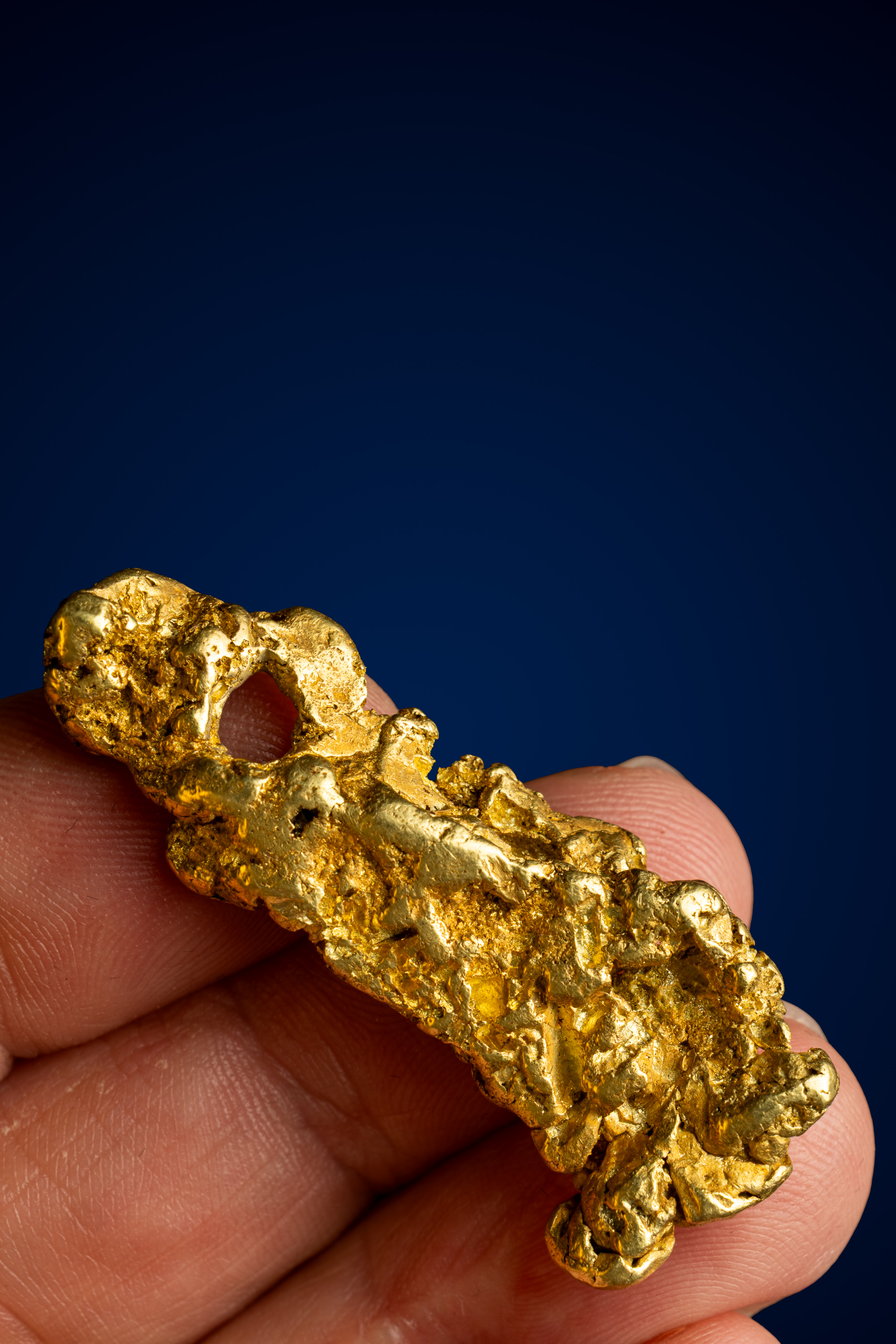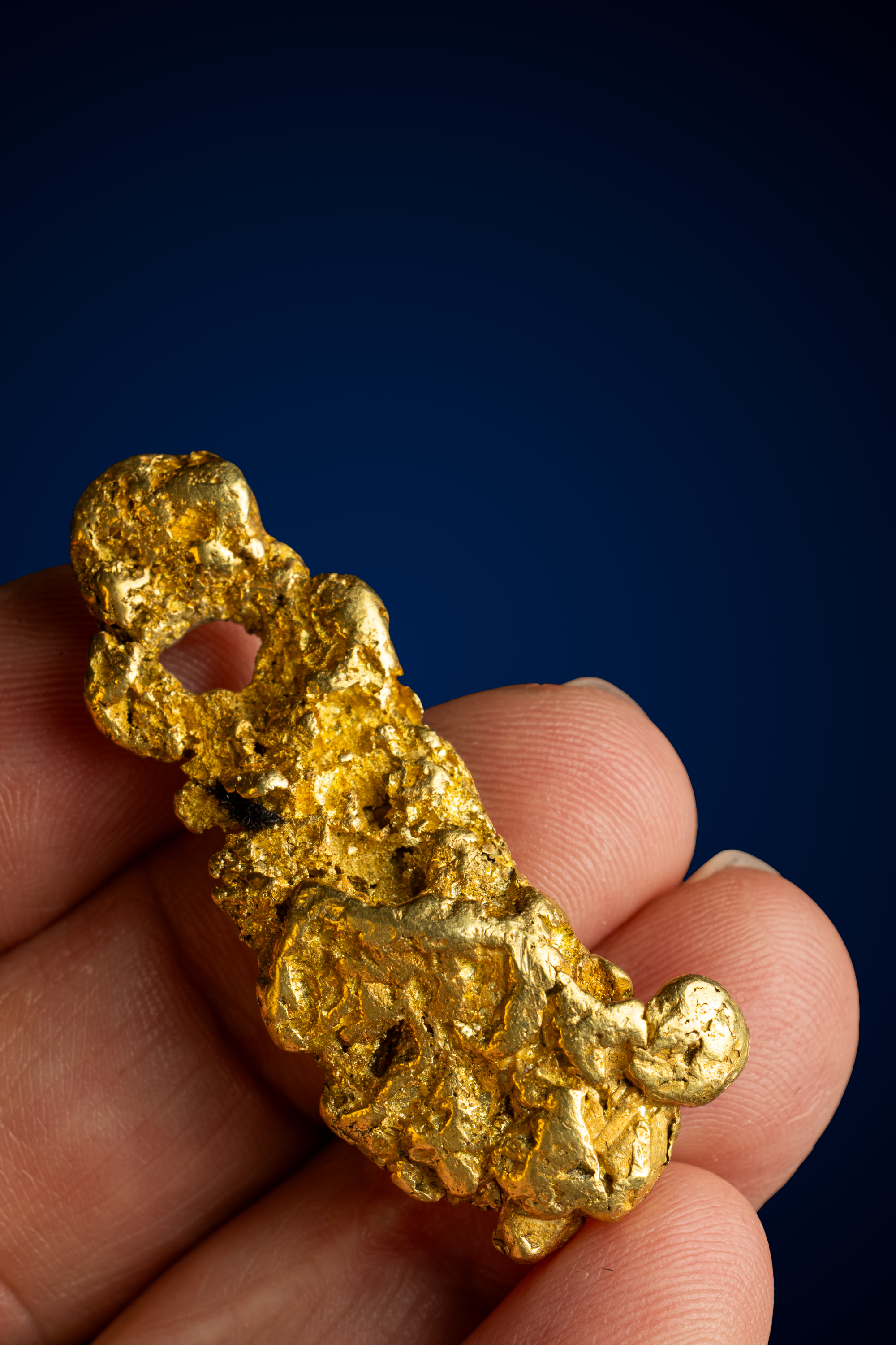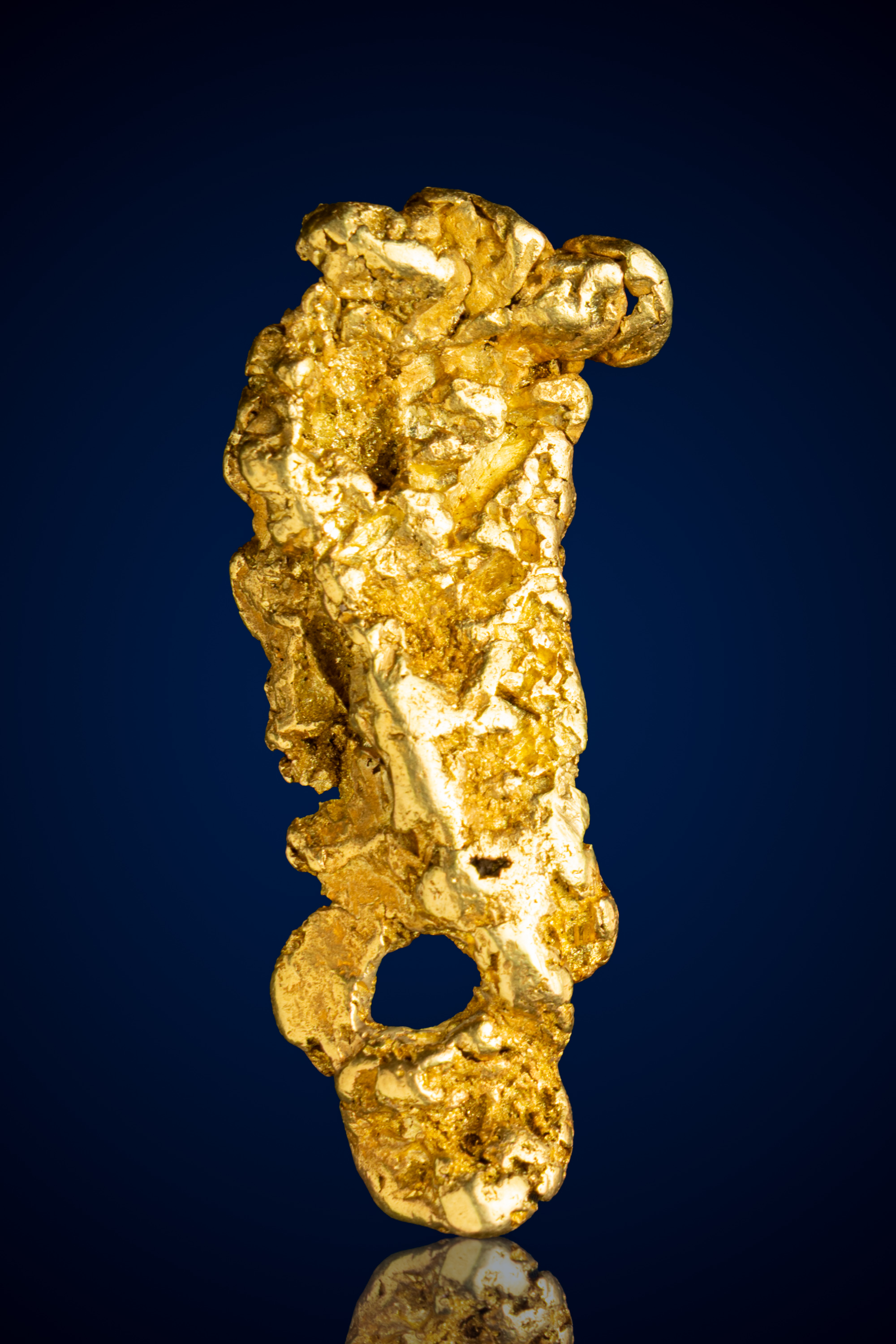 A distinctive natural opening near the lower portion of the nugget adds to its character, giving the piece a sculptural, almost architectural quality. This open space, along with the nugget’s vertical, free-form profile, enhances its visual interest and makes it especially striking as a display specimen.