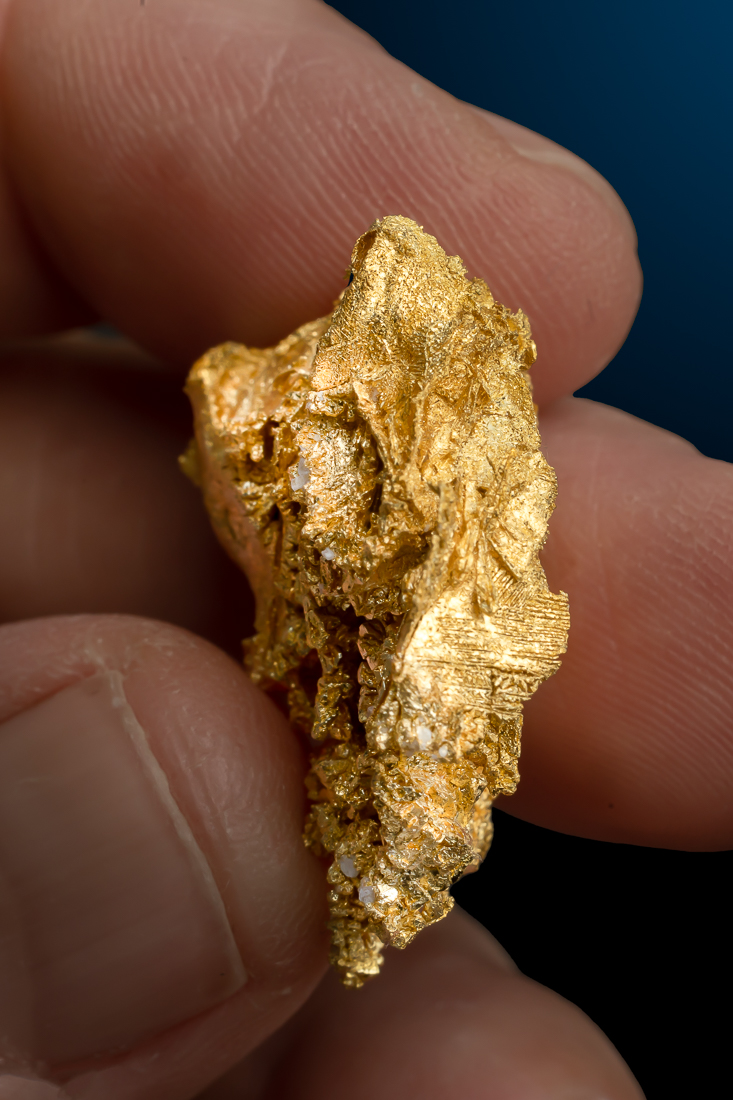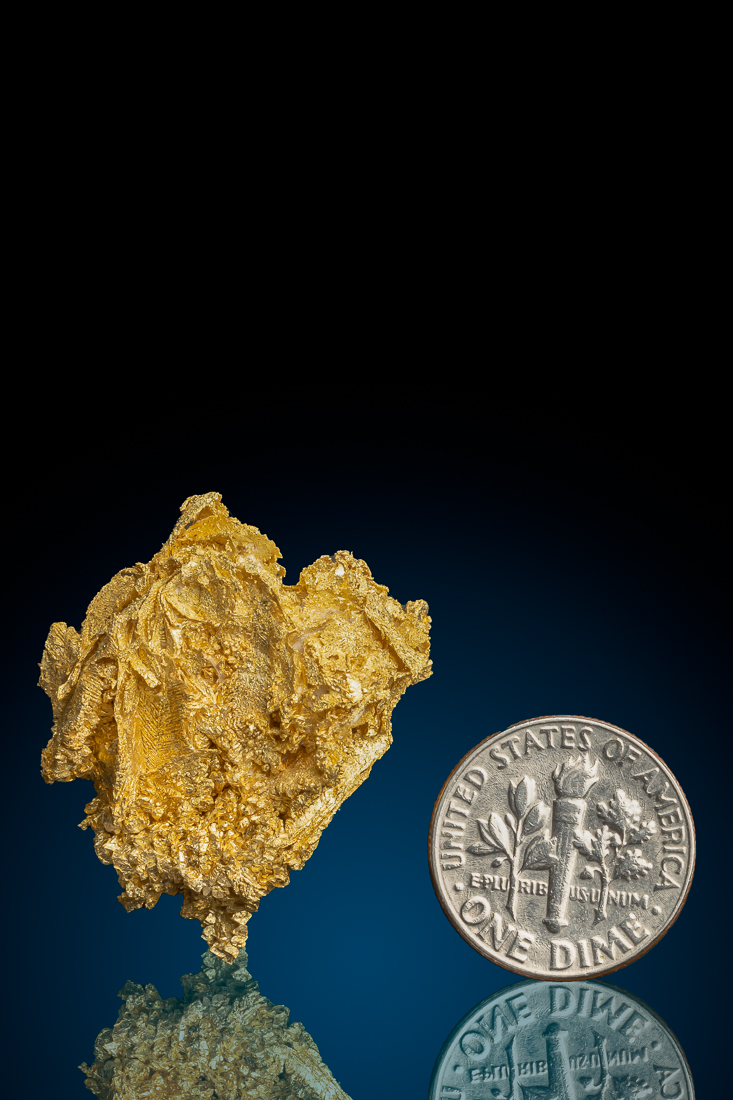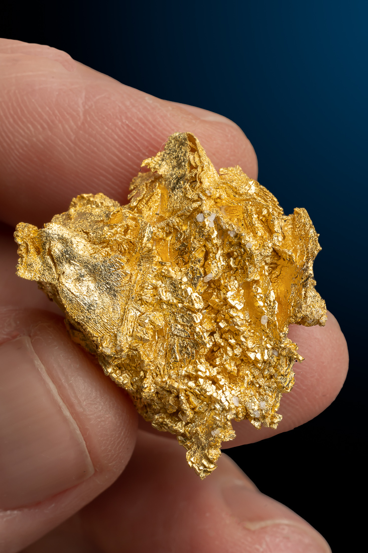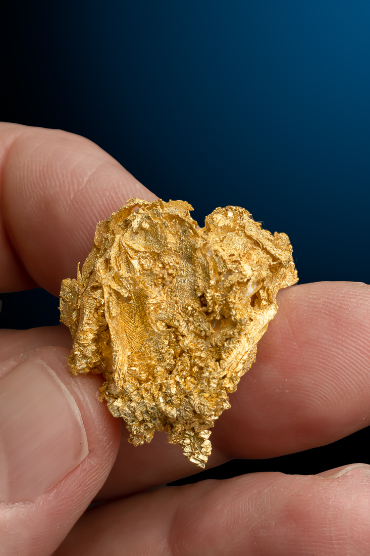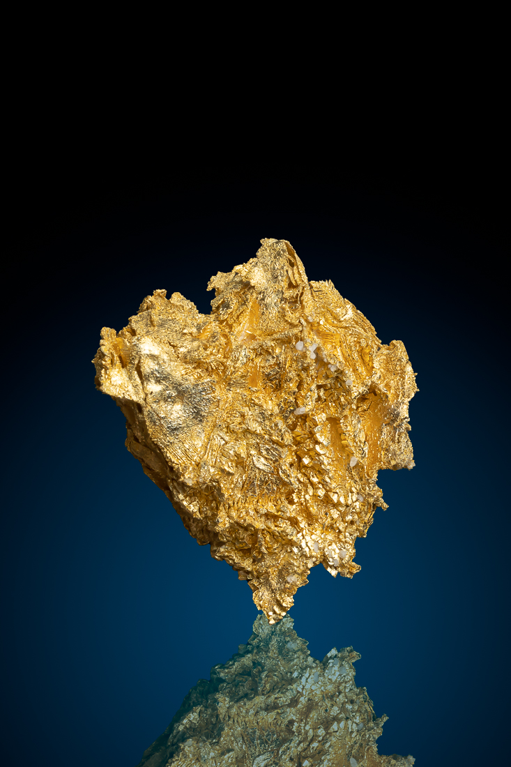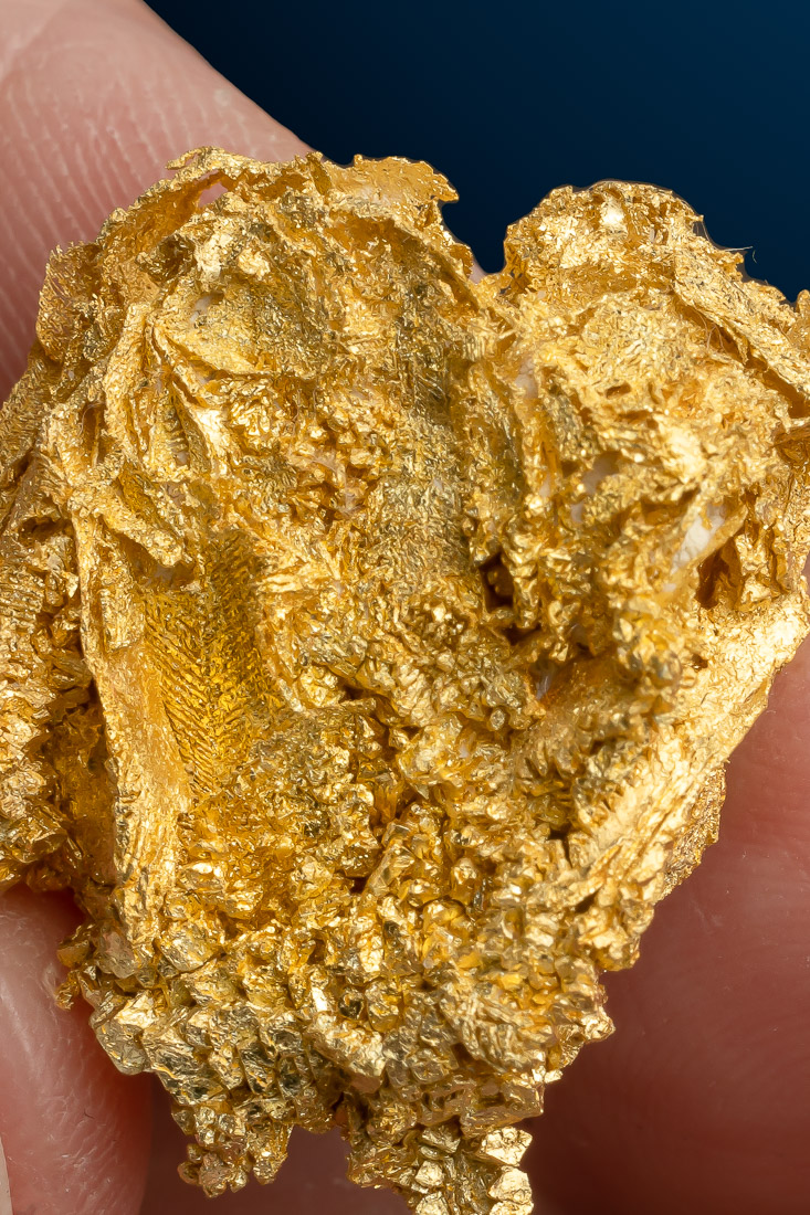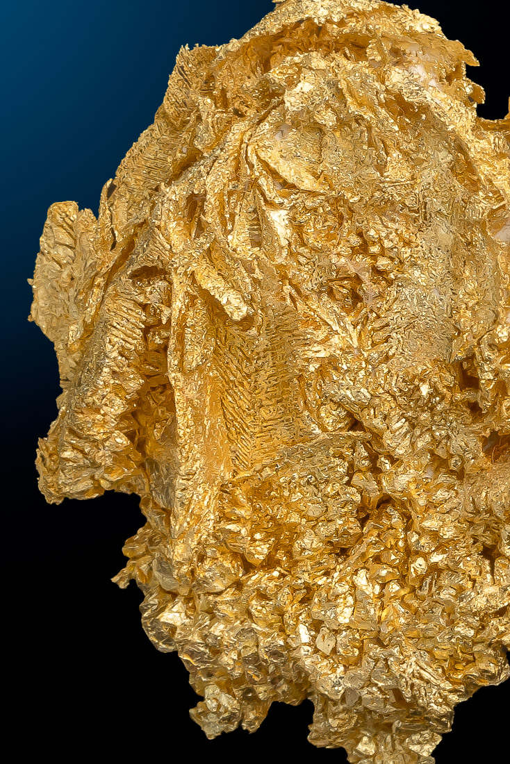 An exceptional piece of natural gold and a beautiful buttery yellow gold color with faceted "feather" striation patterns and beautiful octahedron gold crystals. I count no less than 6 layers of crystallized gold leaves that have been compressed by nature to form this one very unusual and brilliant gold specimen. Without any doubt, this could only be a piece of gold from the famous Round Mountain Gold Mine in Nye County, Nevada. The gold that came from this mine is like none other in the world and this piece is an exquisite example with sharp crystallization and wonderful herringbone leaves clustered together. It really doesn't get any better than Round Mountain and this piece showcases why it is so highly sought after and collectable.
