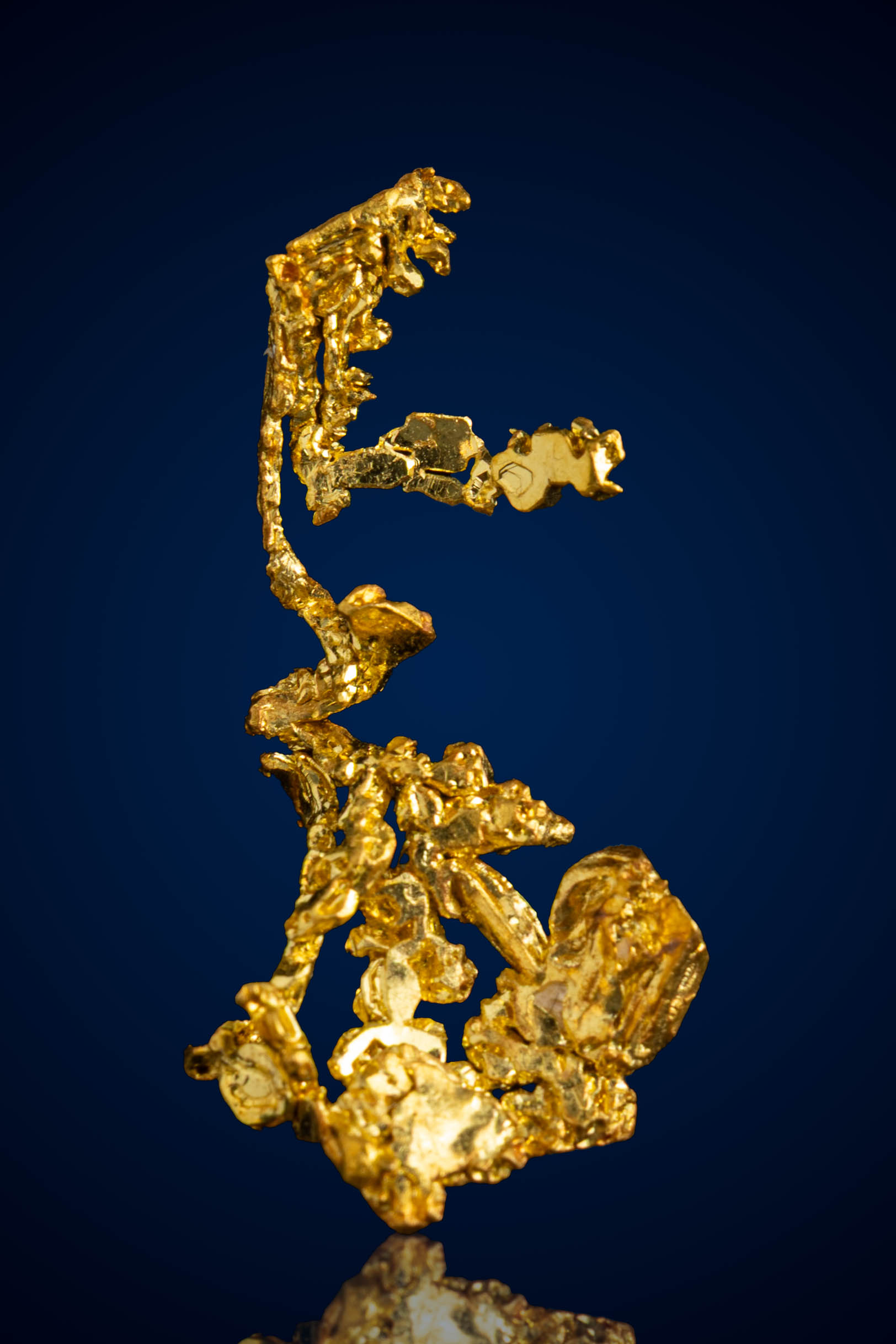 This piece displays an elegant vertical growth habit, with branching gold rising upward in a fluid, almost architectural structure. Elongated crystalline segments and angular faces catch the light beautifully, producing brilliant flashes of rich California gold luster. The upper portion features a distinctive projecting arm of flattened crystalline gold, while the lower section anchors the specimen with thicker, intergrown formations that add balance and presence.