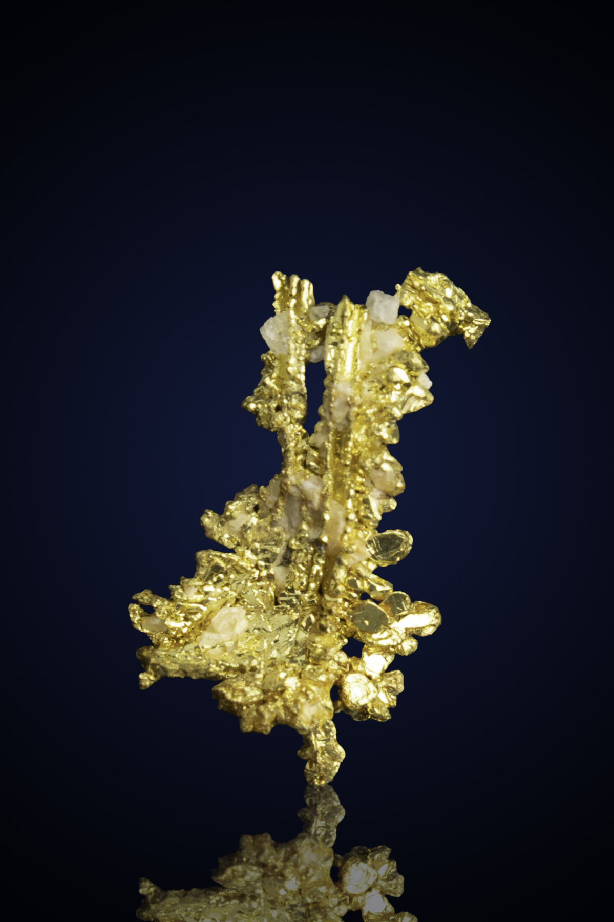 The gold displays an intense, mirror-like luster with exquisite texture, forming stacked plates and branching structures that capture and reflect light from every angle. The embedded quartz highlights the gold’s purity and natural origin, adding contrast and enhancing its visual impact.