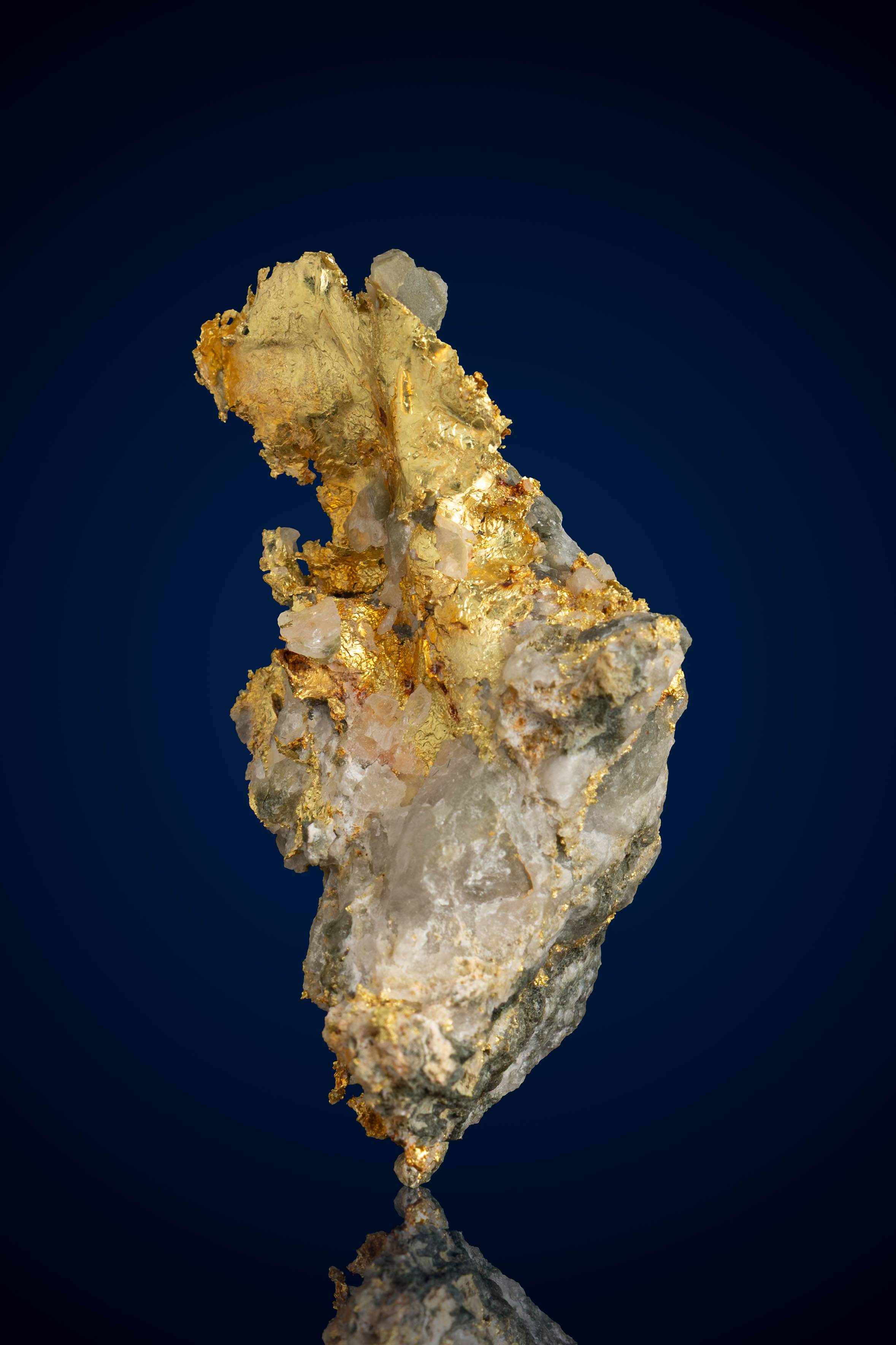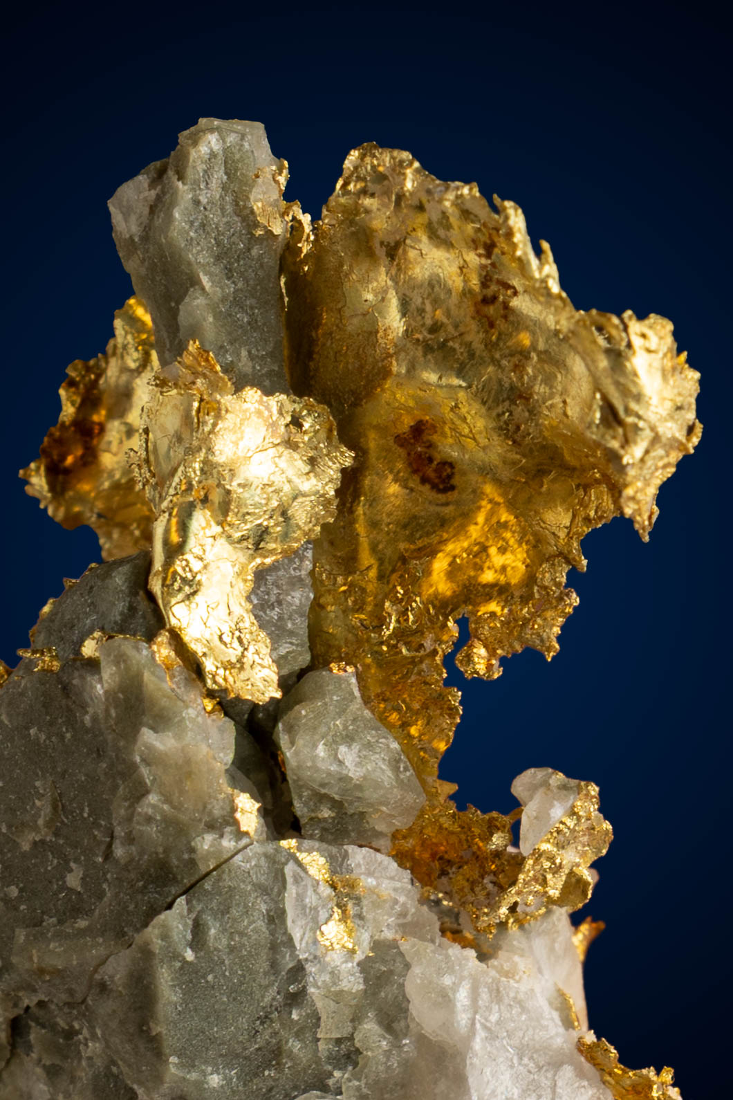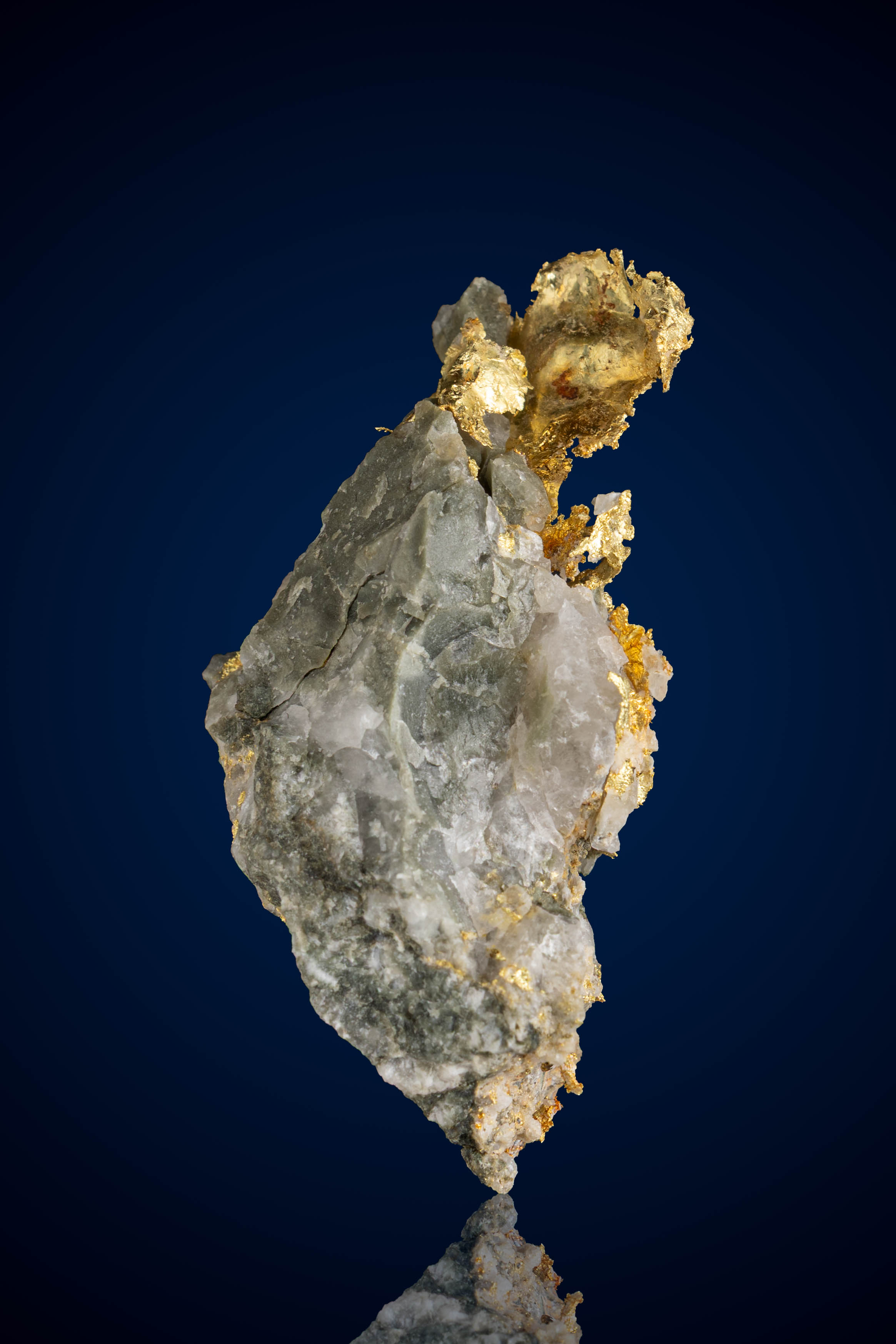 The gold exhibits a natural crystalline texture with intricate surfaces that catch and reflect light from every angle, highlighting the vivid contrast between the warm metallic luster of the gold and the cool, translucent tones of the quartz matrix. Specimens from the Oriental Mine are highly regarded for their aesthetic gold crystallization, and this piece displays that character beautifully.