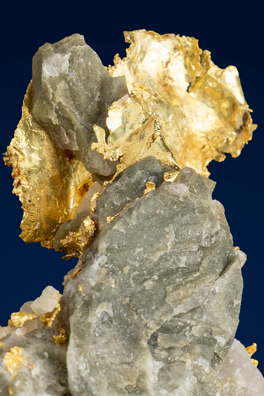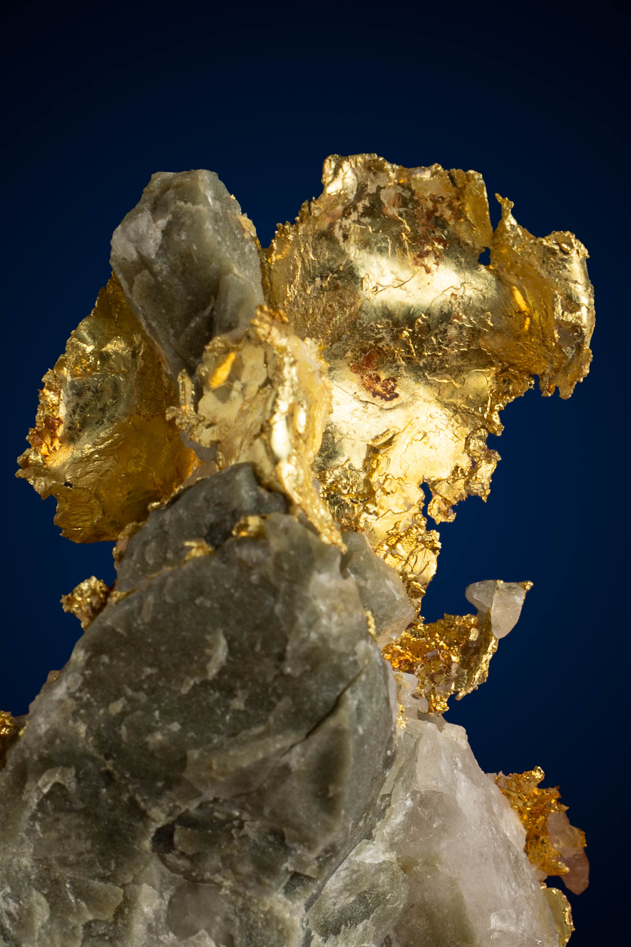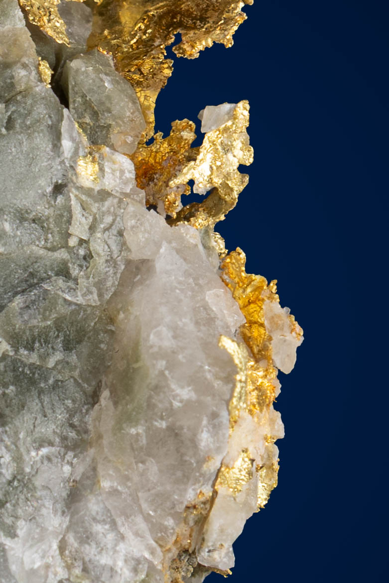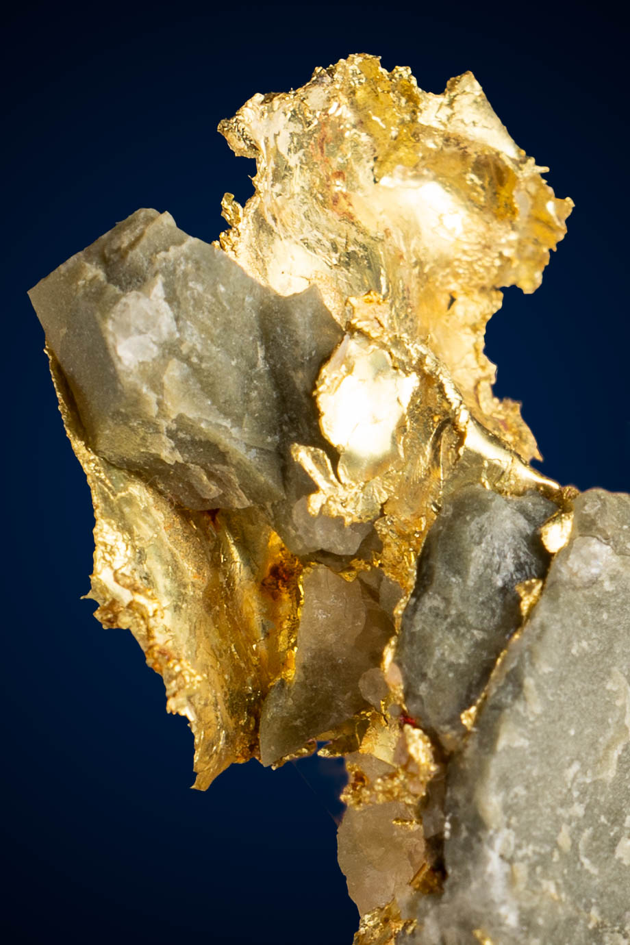 The gold exhibits a natural crystalline texture with intricate surfaces that catch and reflect light from every angle, highlighting the vivid contrast between the warm metallic luster of the gold and the cool, translucent tones of the quartz matrix. Specimens from the Oriental Mine are highly regarded for their aesthetic gold crystallization, and this piece displays that character beautifully.