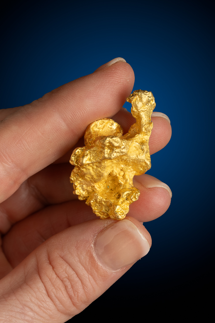 A very thick and heavy example of the natural gold nuggets that are still being found in Australia. This piece comes from the gold fields of Western Australia and is a very clean (no host rock) gold nugget with a beautiful buttery gold color.