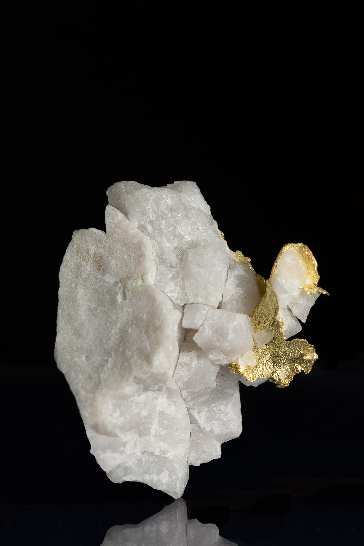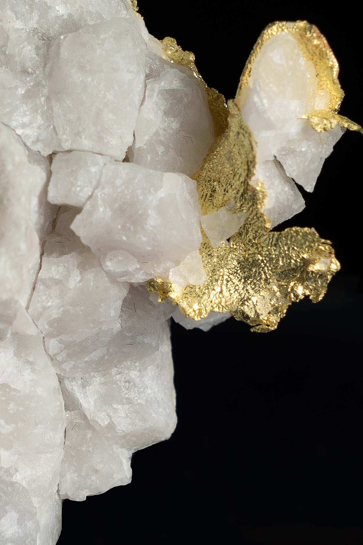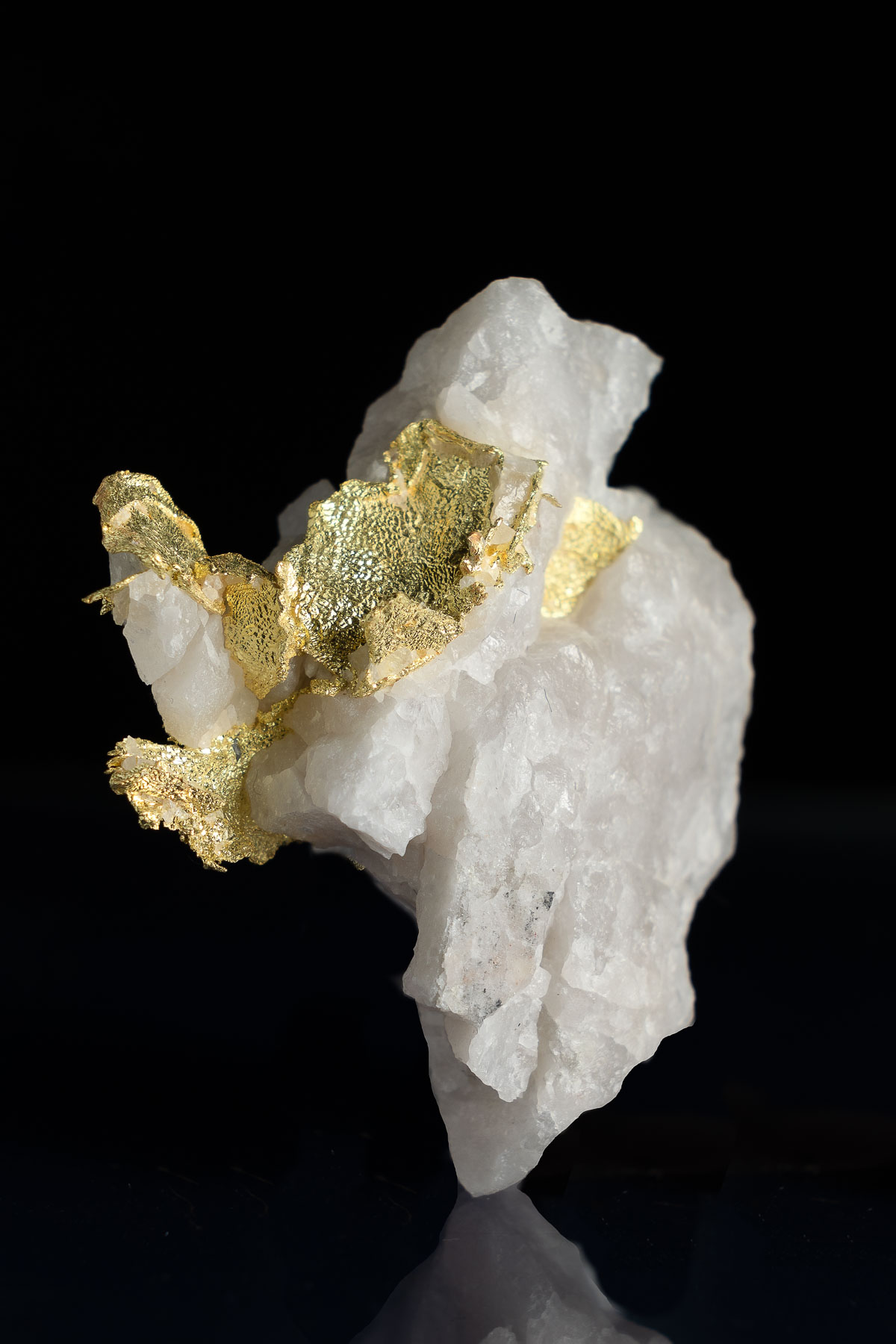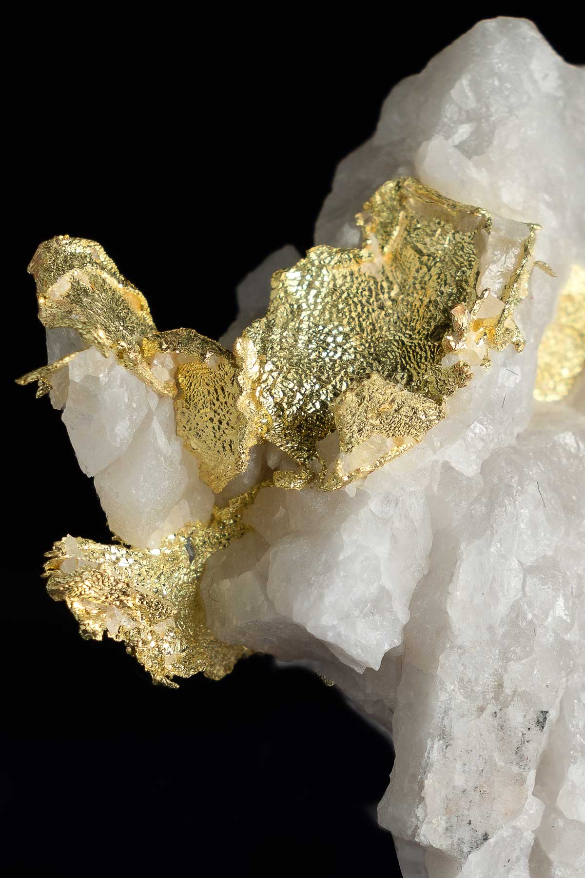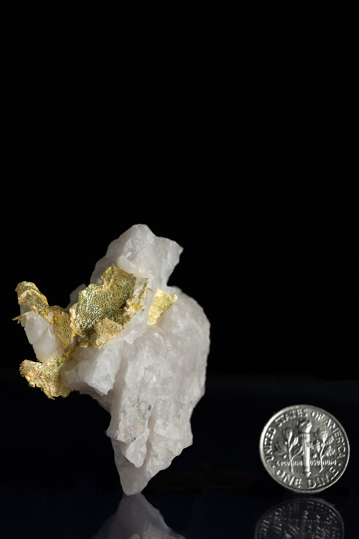 A large and well formed crystalized leaf gold in quartz specimen from the Harvard Gold Mine near Jamestown, California. The aesthetics of this piece are fantastic with bright white quartz and luminous yellow gold intertwined and branching from the quartz. This piece was found at the 366 meter bench that was accessed by repelling down from the top of the open pit.
