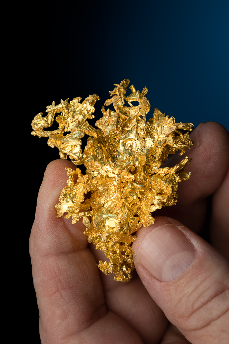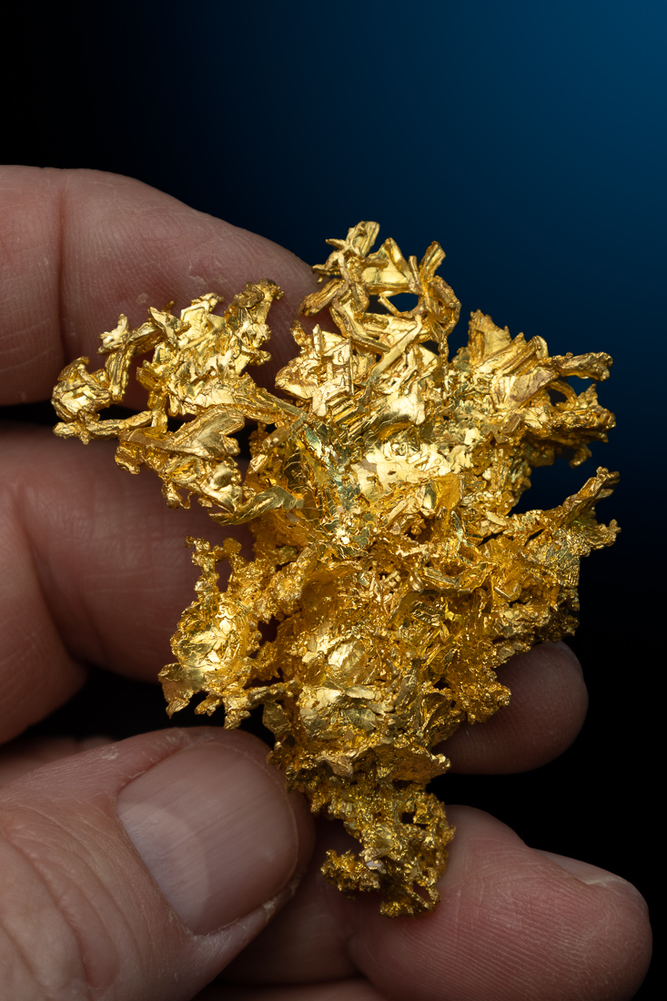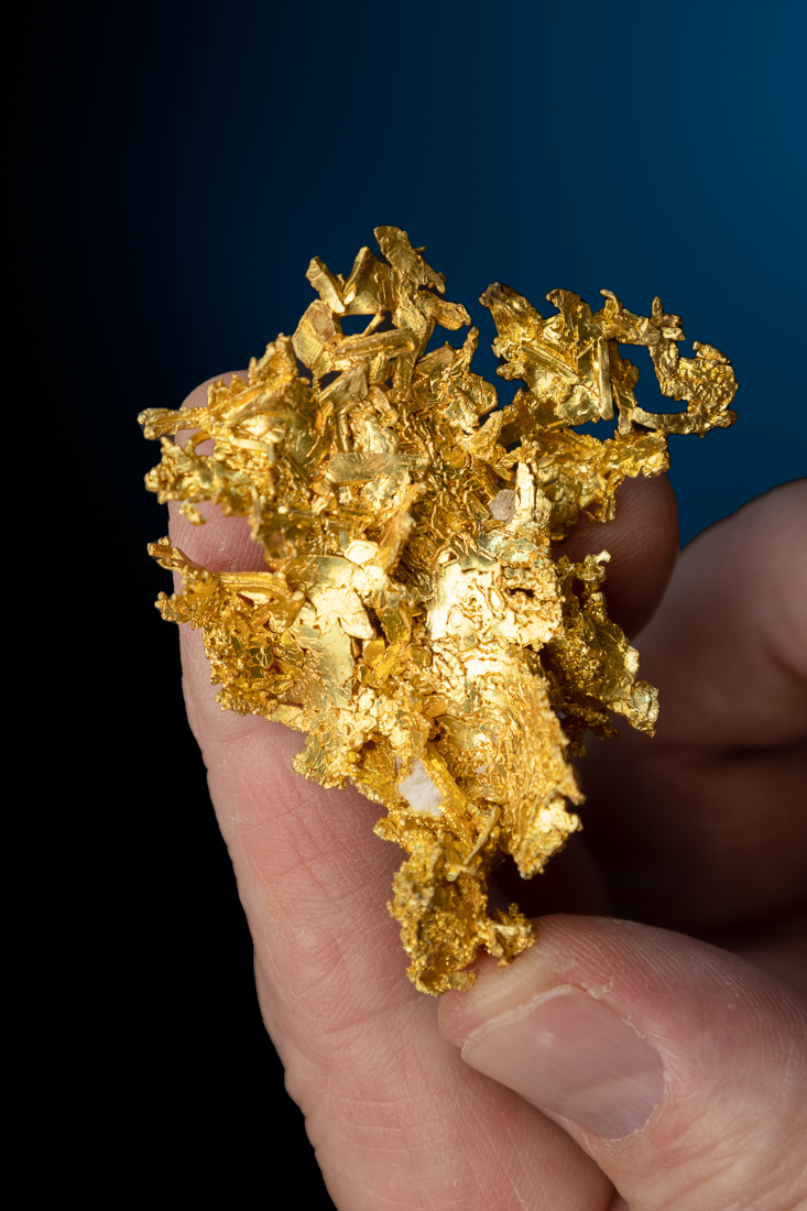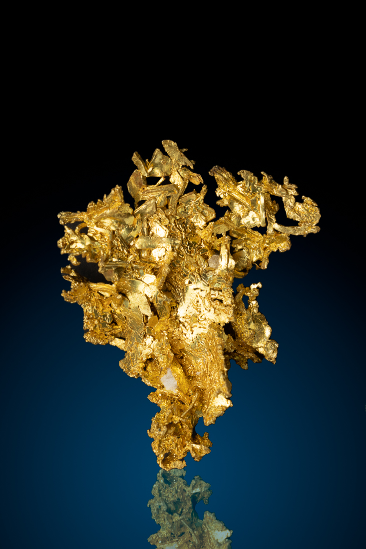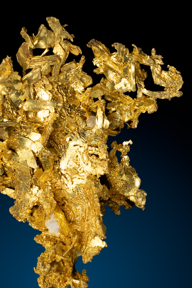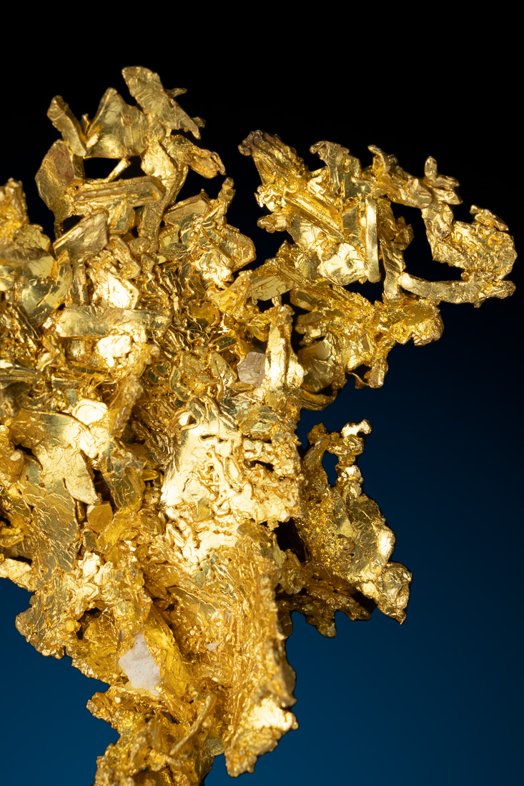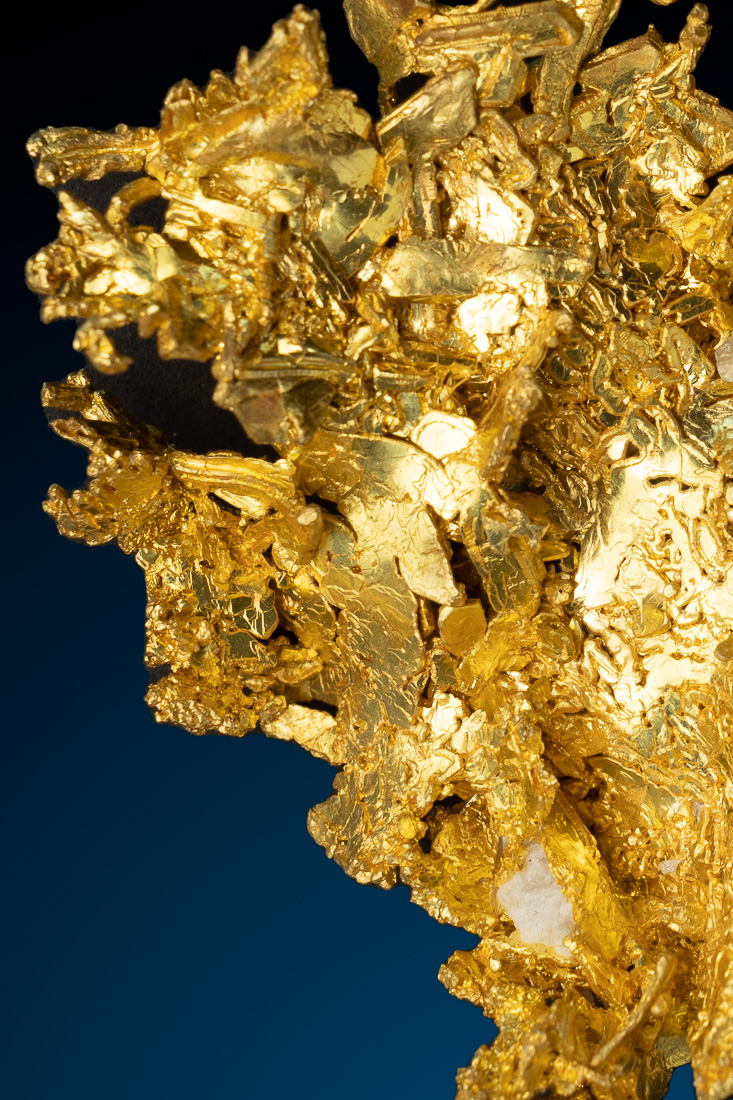 Without equation, one of the most famous gold mines in California was the Eagles Nest Gold Mine in Placer County. This piece is a great example of the high caliber gold that was found at this location - most notably, the fantastic luster and sharp faceted crystallization of the gold that has an almost mirror like surface. This extraordinary specimen is exceptionally rare with hoppered and leaf formations. This is one of my most memorable pieces and will make an unmatched addition to any collection.