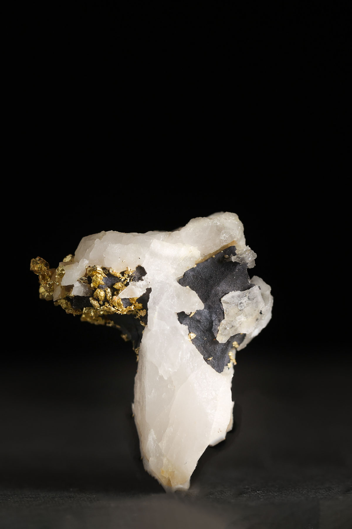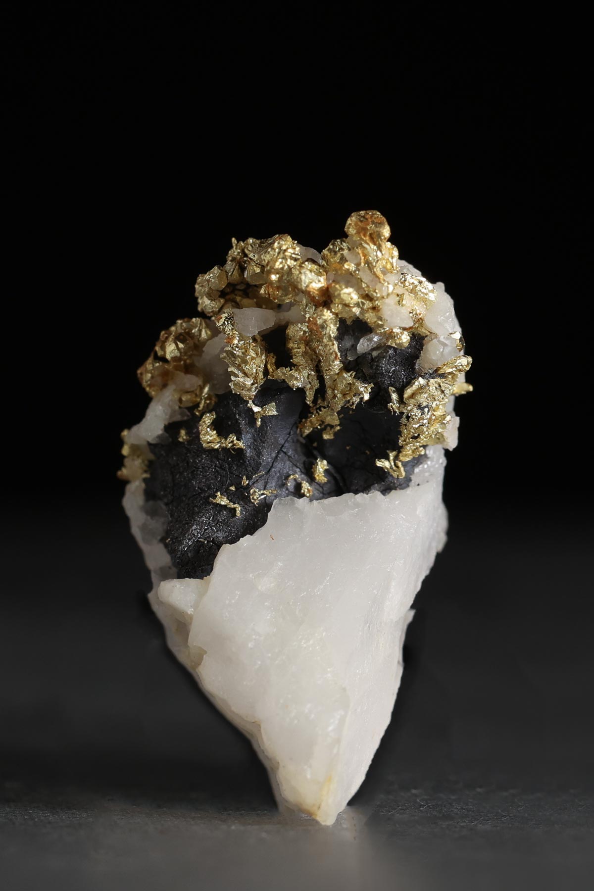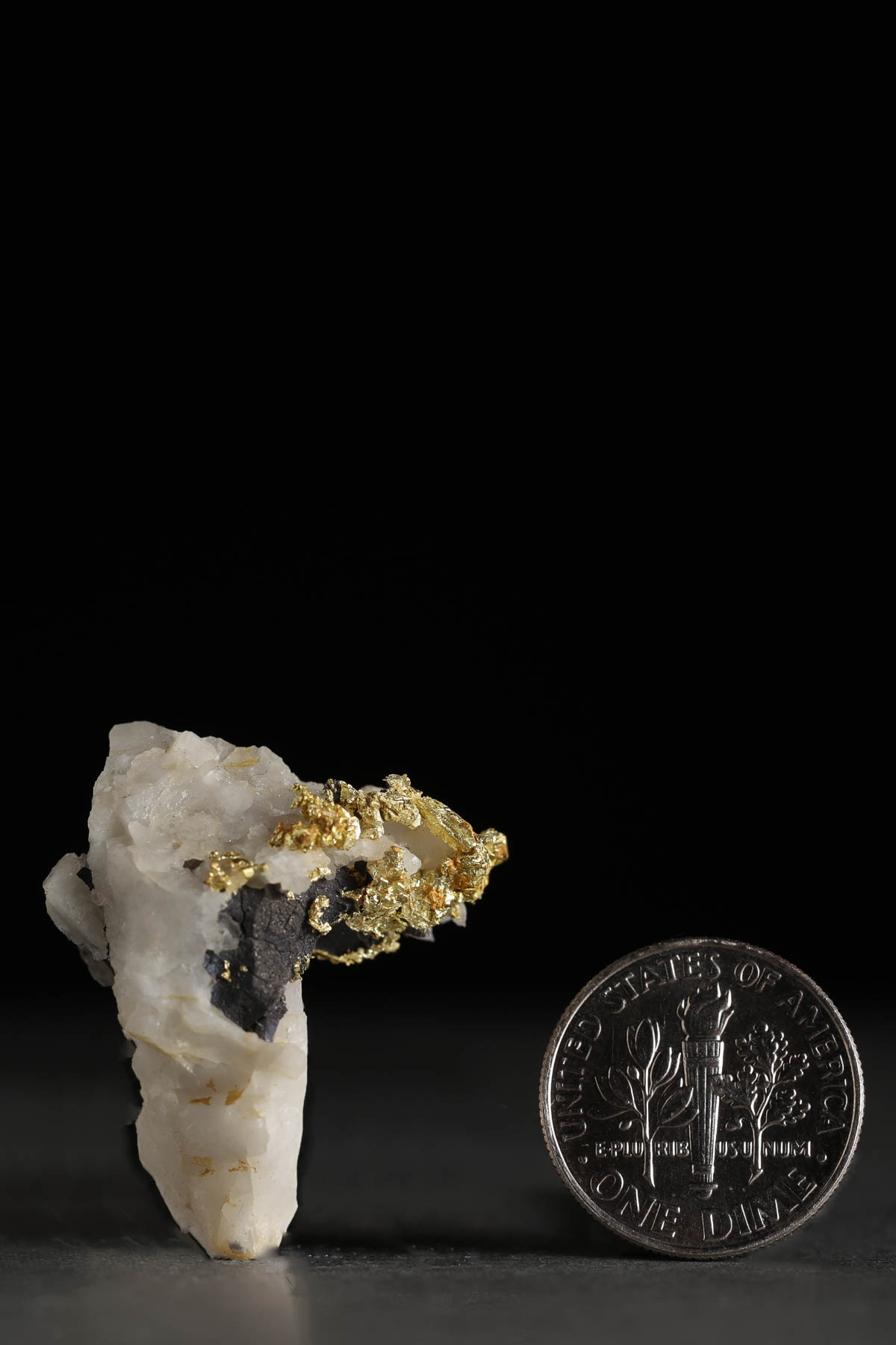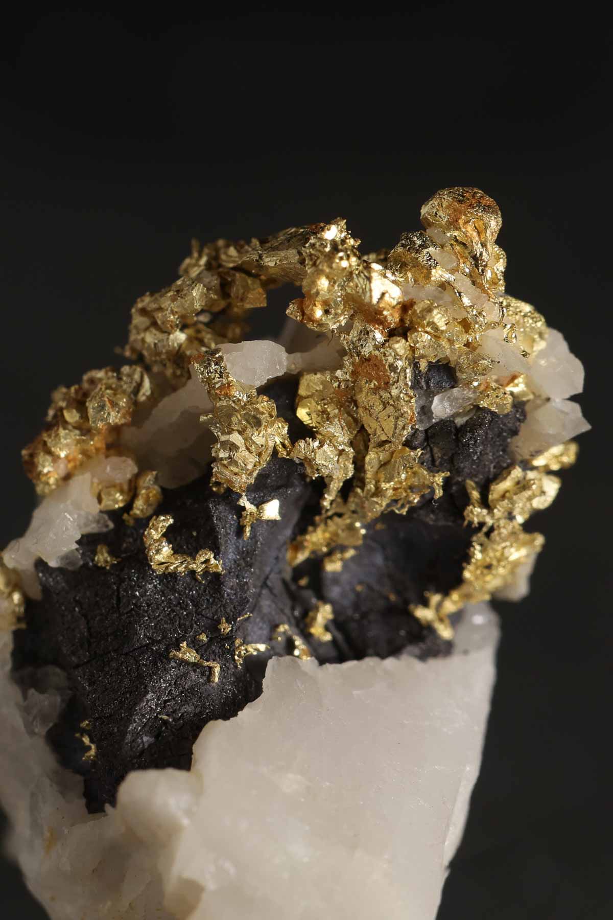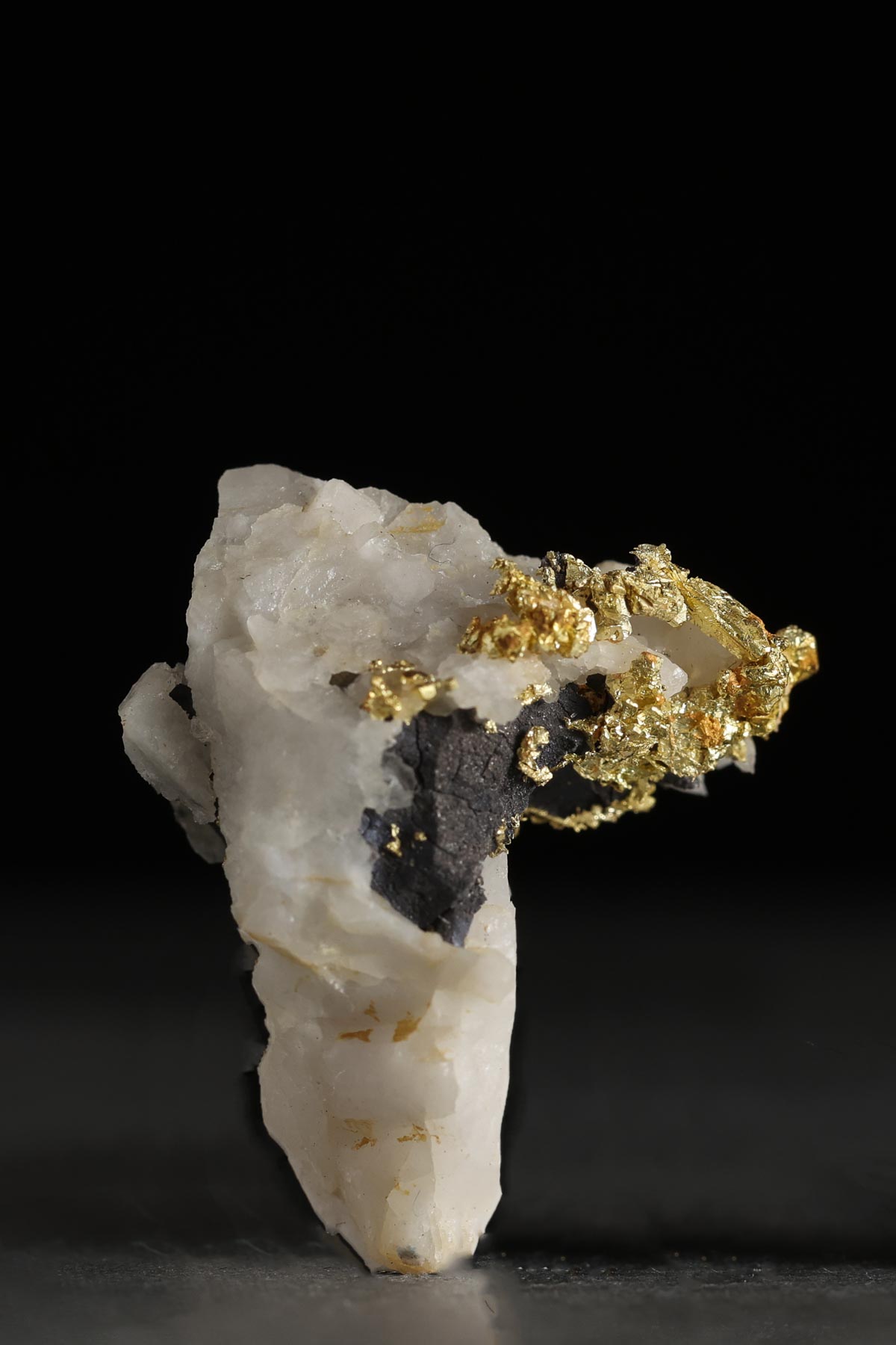 The gold and arsenopyrite specimens from the Oriental Gold Mine in the Allegheny District of California are some exceptional gold specimens and create a beautiful contrast between the Brilliant crystallized yellow gold, white quartz, and black arsenopyrite. These were part of the owner Dolald Dickey's private collection and he preserved what he thought was special from the mine and melted the rest. The mine has long been closed and these are what remains from the location.